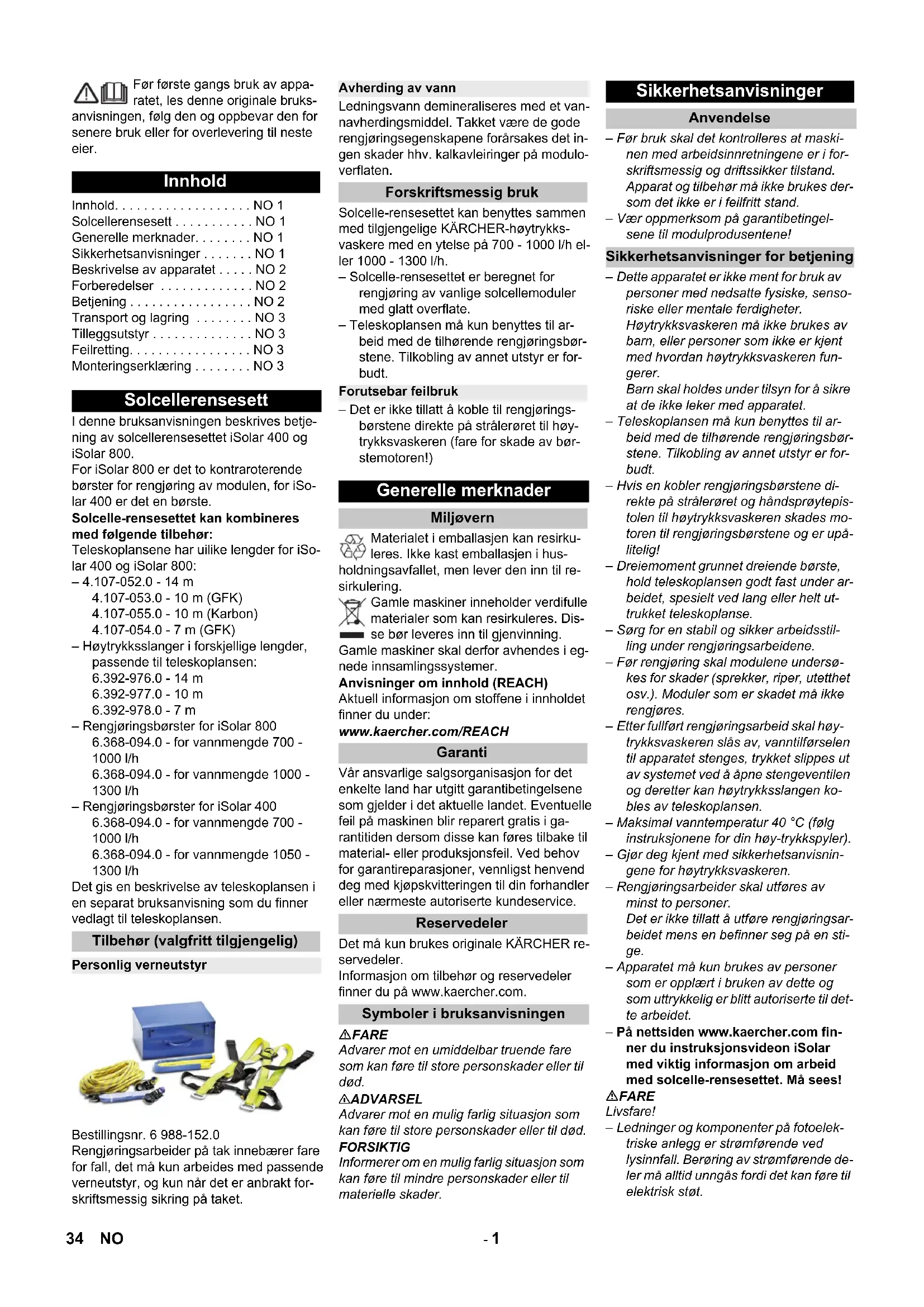 • må kun anvendes med enkelt børste Afhjælpning af fejl Højtryksrenseren tænder / slukker Rengøringsbørsten drejer ikke Rensemiddel bliver ikke indsuget Teleskoplansens klemme holder ikke Spærrehåndtag Bestillingsnr. ø 36 mm 6.373-995.0 ø 34 mm 6.373-996.0 ø 28 mm 6.373-997.0 Monteringsforklaring Produkt: Tilbehør iSolar 400 iSolar 800 Type: 6.368-092.0, 6.368-093.0 6.368-094.0, 6.368-095.0 Anvendte harmoniserede standarder I overensstemmelse med: EN 60335–2–79 Chairman of the Board of Management Director Regulatory Affairs & Certification 33DA- 1 Før første gangs bruk av appa- ratet, les denne originale bruks- anvisningen, følg den og oppbevar den for senere bruk eller for overlevering til neste eier. I denne bruksanvisningen beskrives betje- ning av solcellerensesettet iSolar 400 og iSolar 800. For iSolar 800 er det to kontraroterende børster for rengjøring av modulen, for iSo- lar 400 er det en børste. Solcelle-rensesettet kan kombineres med følgende tilbehør: Teleskoplansene har uilike lengder for iSo- lar 400 og iSolar 800: – 4.107-052.0 - 14 m 4.107-053.0 - 10 m (GFK) 4.107-055.0 - 10 m (Karbon) 4.107-054.0 - 7 m (GFK) – Høytrykksslanger i forskjellige lengder, passende til teleskoplansen: 6.392-976.0 - 14 m 6.392-977.0 - 10 m 6.392-978.0 - 7 m – Rengjøringsbørster for iSolar 800 6.368-094.0 - for vannmengde 700 - 1000 l/h 6.368-094.0 - for vannmengde 1000 - 1300 l/h – Rengjøringsbørster for iSolar 400 6.368-094.0 - for vannmengde 700 - 1000 l/h 6.368-094.0 - for vannmengde 1050 - 1300 l/h Det gis en beskrivelse av teleskoplansen i en separat bruksanvisning som du finner vedlagt til teleskoplansen. Bestillingsnr. 6 988-152.0 Rengjøringsarbeider på tak innebærer fare for fall, det må kun arbeides med passende verneutstyr, og kun når det er anbrakt for- skriftsmessig sikring på taket. Ledningsvann demineraliseres med et van- navherdingsmiddel. Takket være de gode rengjøringsegenskapene forårsakes det in- gen skader hhv. kalkavleiringer på modulo- verflaten. Solcelle-rensesettet kan benyttes sammen med tilgjengelige KÄRCHER-høytrykks- vaskere med en ytelse på 700 - 1000 l/h el- ler 1000 - 1300 l/h. – Solcelle-rensesettet er beregnet for rengjøring av vanlige solcellemoduler med glatt overflate. – Teleskoplansen må kun benyttes til ar- beid med de tilhørende rengjøringsbør- stene. Tilkobling av annet utstyr er for- budt. – Det er ikke tillatt å koble til rengjørings- børstene direkte på strålerøret til høy- trykksvaskeren (fare for skade av bør- stemotoren!) Materialet i emballasjen kan resirku- leres. Ikke kast emballasjen i hus- holdningsavfallet, men lever den inn til re- sirkulering. Gamle maskiner inneholder verdifulle materialer som kan resirkuleres. Dis- se bør leveres inn til gjenvinning. Gamle maskiner skal derfor avhendes i eg- nede innsamlingssystemer. Anvisninger om innhold (REACH) Aktuell informasjon om stoffene i innholdet finner du under: www.kaercher.com/REACH Vår ansvarlige salgsorganisasjon for det enkelte land har utgitt garantibetingelsene som gjelder i det aktuelle landet. Eventuelle feil på maskinen blir reparert gratis i ga- rantitiden dersom disse kan føres tilbake til material- eller produksjonsfeil. Ved behov for garantireparasjoner, vennligst henvend deg med kjøpskvitteringen til din forhandler eller nærmeste autoriserte kundeservice. Det må kun brukes originale KÄRCHER re- servedeler. Informasjon om tilbehør og reservedeler finner du på www.kaercher.com. FARE Advarer mot en umiddelbar truende fare som kan føre til store personskader eller til død. 몇 ADVARSEL Advarer mot en mulig farlig situasjon som kan føre til store personskader eller til død. FORSIKTIG Informerer om en mulig farlig situasjon som kan føre til mindre personskader eller til materielle skader. – Før bruk skal det kontrolleres at maski- nen med arbeidsinnretningene er i for- skriftsmessig og driftssikker tilstand. Apparat og tilbehør må ikke brukes der- som det ikke er i feilfritt stand. – Vær oppmerksom på garantibetingel- sene til modulprodusentene! – Dette apparatet er ikke ment for bruk av personer med nedsatte fysiske, senso- riske eller mentale ferdigheter. Høytrykksvaskeren må ikke brukes av barn, eller personer som ikke er kjent med hvordan høytrykksvaskeren fun- gerer. Barn skal holdes under tilsyn for å sikre at de ikke leker med apparatet. – Teleskoplansen må kun benyttes til ar- beid med de tilhørende rengjøringsbør- stene. Tilkobling av annet utstyr er for- budt. – Hvis en kobler rengjøringsbørstene di- rekte på strålerøret og håndsprøytepis- tolen til høytrykksvaskeren skades mo- toren til rengjøringsbørstene og er upå- litelig! – Dreiemoment grunnet dreiende børste, hold teleskoplansen godt fast under ar- beidet, spesielt ved lang eller helt ut- trukket teleskoplanse. – Sørg for en stabil og sikker arbeidsstil- ling under rengjøringsarbeidene. – Før rengjøring skal modulene undersø- kes for skader (sprekker, riper, utetthet osv.). Moduler som er skadet må ikke rengjøres. – Etter fullført rengjøringsarbeid skal høy- trykksvaskeren slås av, vanntilførselen til apparatet stenges, trykket slippes ut av systemet ved å åpne stengeventilen og deretter kan høytrykksslangen ko- bles av teleskoplansen. – Maksimal vanntemperatur 40 °C (følg instruksjonene for din høy-trykkspyler). – Gjør deg kjent med sikkerhetsanvisnin- gene for høytrykksvaskeren. – Rengjøringsarbeider skal utføres av minst to personer. Det er ikke tillatt å utføre rengjøringsar- beidet mens en befinner seg på en sti- ge. – Apparatet må kun brukes av personer som er opplært i bruken av dette og som uttrykkelig er blitt autoriserte til det- te arbeidet. – På nettsiden www.kaercher.com fin- ner du instruksjonsvideon iSolar med viktig informasjon om arbeid med solcelle-rensesettet. Må sees! FARE Livsfare! – Ledninger og komponenter på fotoelek- triske a