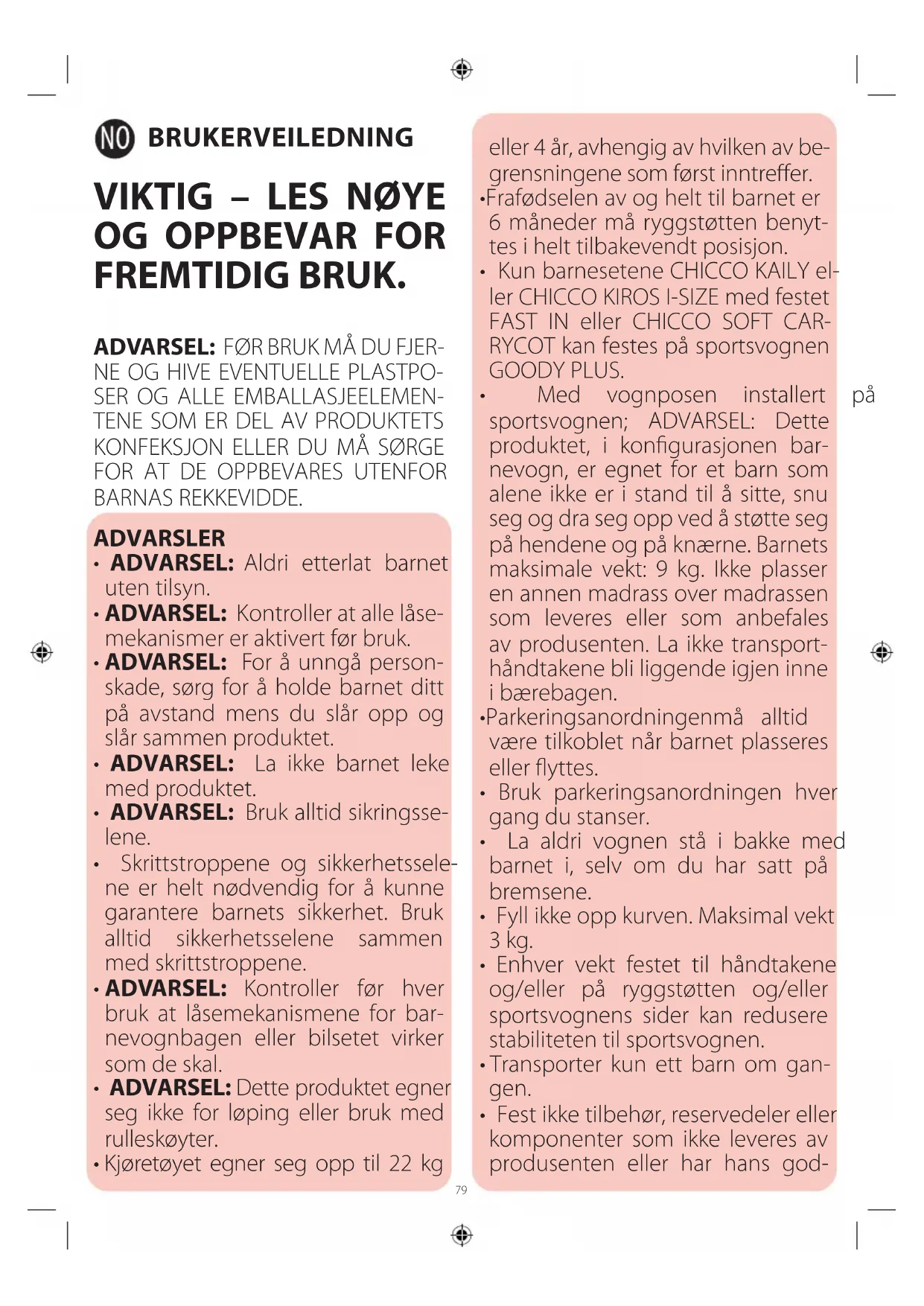 - ADVARSEL: Kontroller før hver bruk at låsemekanismene for bar- nevognbagen eller bilsetet virker som de skal.