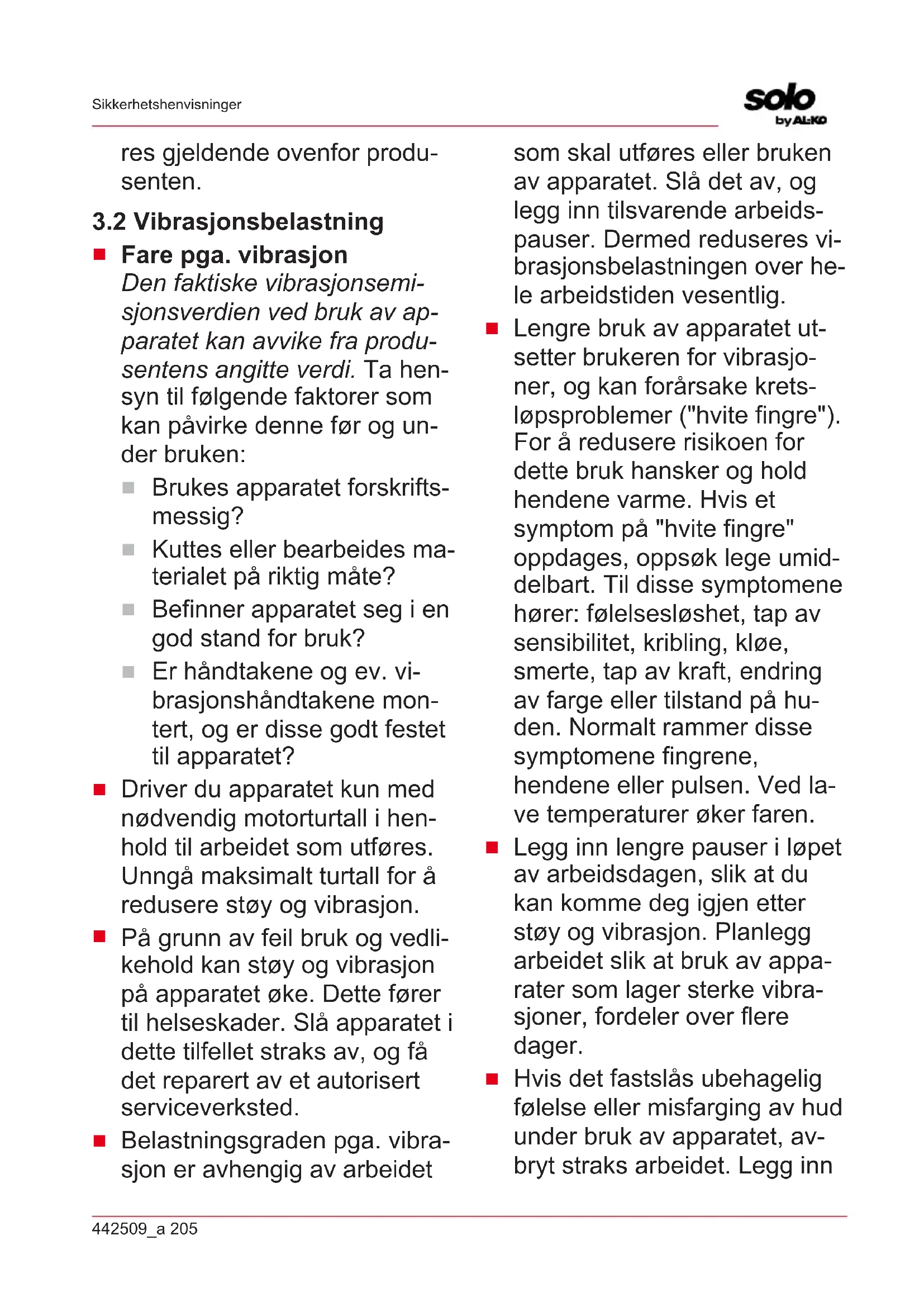 Lengre bruk av apparatet ut- setter brukeren for vibrasjo- ner, og kan forårsake krets- løpsproblemer ("hvite fingre"). For å redusere risikoen for dette bruk hansker og hold hendene varme. Hvis et symptom på "hvite fingre" oppdages, oppsøk lege umid- delbart. Til disse symptomene hører: følelsesløshet, tap av sensibilitet, kribling, kløe, smerte, tap av kraft, endring av farge eller tilstand på hu- den. Normalt rammer disse symptomene fingrene, hendene eller pulsen. Ved la- ve temperaturer øker faren.