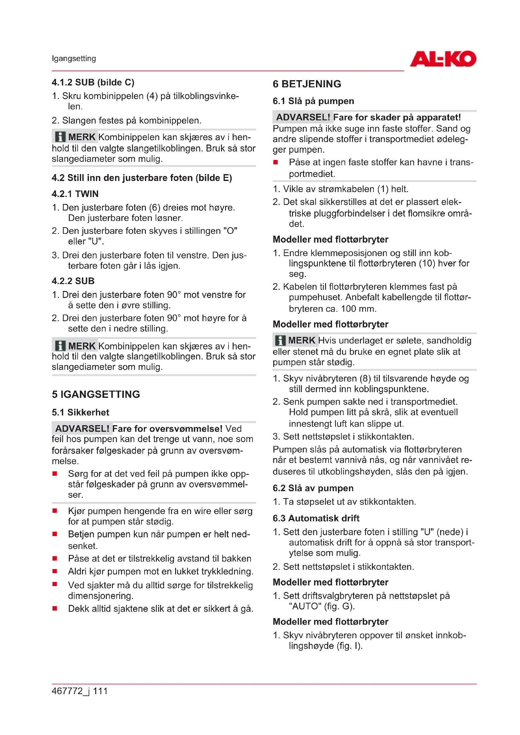 Pumpen slås på automatisk via flottørbryteren når et bestemt vannivå nås, og når vannivået re- duseres til utkoblingshøyden, slås den på igjen.