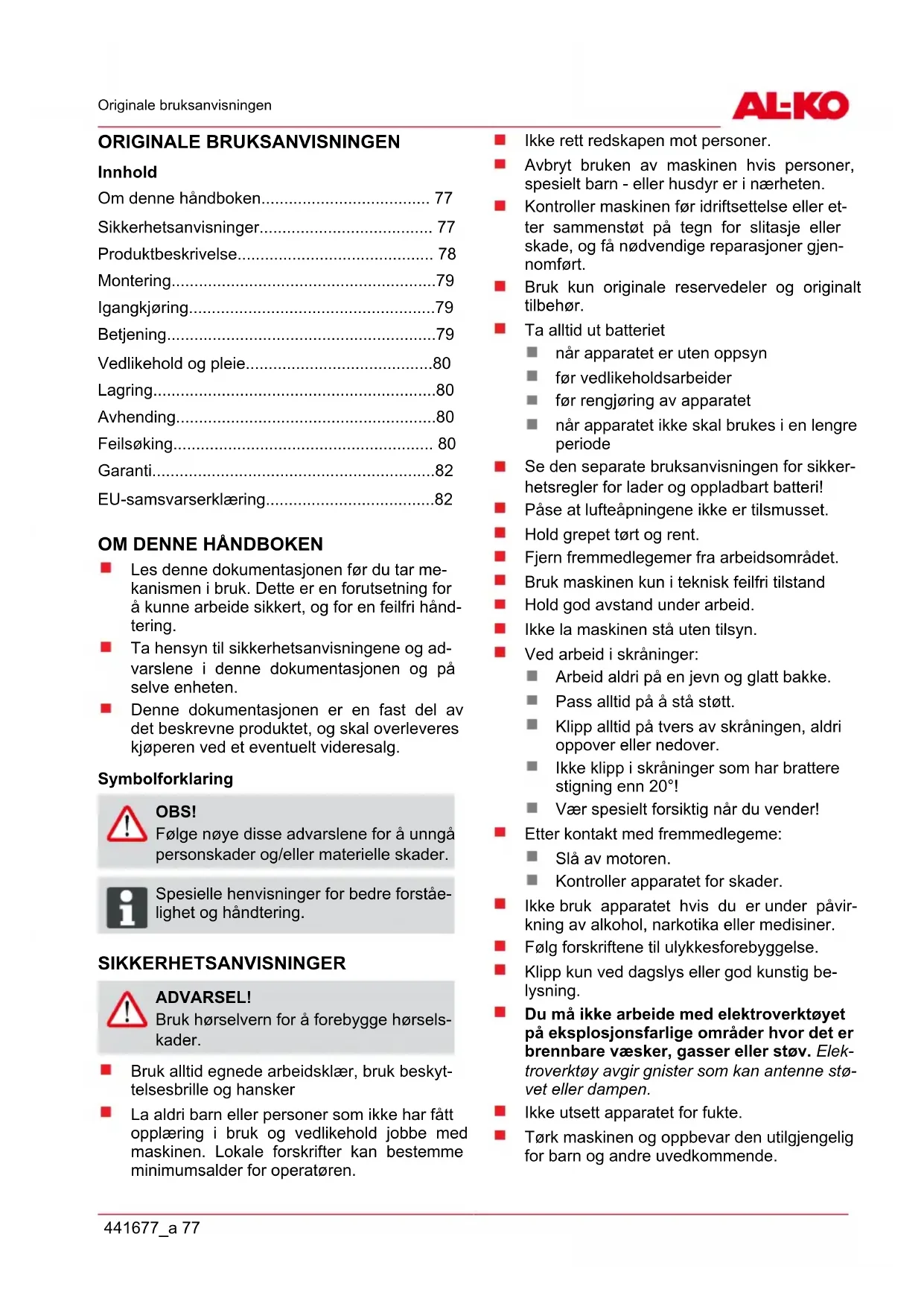 OBS! Ta ut batteriet før alle arbeider på appa- ratet. La kun autoriserte fagverksted utbedre feil. Ikke spyl av apparatet med vann! Vann som trenger inn i maskinen kan føre til feil. Ikke utsett apparatet for fukte. Kontroller apparatet i regelmessige avstan- der på korrekt tilstand. Ikke bruk rengjørings- hhv. løsemiddel. Du kan da skade apparatet uopprettelig. LAGRING Rens apparat og tilbehørdelene etter hver bruk. Tørk maskinen og oppbevar den utilgjengelig for barn og andre uvedkommende. Lagre apparatet på et tørt, frostfritt sted. Ta batteriet ut av redskapen før det lagres. AVHENDING Kasserte enheter, batterier eller opp- ladbare batterier må ikke kastes i hus- holdningsavfallet! Emballasje, utstyr og tilbehør er laget av resirkulerbare materialer og skal avhen- des deretter. Batterier skal kun avhendes i utladet tilstand Brukeren er forpliktet til å returnere batteriene og batteriene. Disse kan leveres på salgsste- dene gratis. Det er følgende muligheter for deponering: Via faghandelen Hos en returstasjon som har CCR-merke FEILSØKING Feil Mulig årsak Løsning Motoren går ikke Motorbeskyttelsesbryteren har ko- blet seg ut Batteri utladet Vent til motorbeskyttelsesbryteren slår trimmeren på igjen. Lade batteriet Trimmer vibrerer Trådspolen er tilsmusset Rens trådspole, skift om nødven- dig Batteriets driftstid reduse- res betydelig Gresset er for høyt eller for fuktig For lav klippehøyde Batteri utladet siden det ikke ble brukt over lengre tid Batteriet er oppbrukt La gresset tørke, still inn klip- pehøyden høyere Still inn klippehøyden høyere Lade batteriet Bytt batteri. Bruk kun originaltil- behør fra produsenten. Batteriet kan ikke lades opp Ladeplugg eller kontakt skitten Defekt batteri eller lader Bestill reservedeler iht. reserve- delskortetFeilsøking 441677_a 81 ADVICE Ved feil som ikke er oppført i denne tabellen, eller som du ikke selv kan utbedre, må du kontakte vår ansvarlige kundeservice.no Garanti 82 LB 36 Li GARANTI Vi utbedrer eventuelle material- eller produksjonsfeil på maskinen innenfor den lovmessige foreldelses- fristen for melding av mangler eller feil, etter vårt valg ved å reparere eller levere reservedeler. Forel- delsesfristen bestemmes ut fra gjeldende lovgivning i landet hvor maskinen ble kjøpt. Vår garanti gjelder kun ved: Korrekt behandling av maskinen Overholdelse av bruksanvisningen Bruk av originale reservedeler Garantien gjelder ikke ved: Forsøk på å reparere maskinen Tekniske endringer på maskinen ikke tiltenkt bruk (f.eks. industriell eller kommu- nal bruk) Følgende omfattes ikke av garantien Lakkskader som skyldes normal slitasje Slitasjedeler som på reservedelskortet er merket med ramme [xxx xxx (x)] Forbrenningsmotorer – for disse gjelder de separate garantibetingelsene til den aktuelle motorpro- dusenten Garantitiden begynner når første sluttbruker kjøper maskinen. Datoen på den originale kjøpskvitteringen er retningsgivende. Ved et garantikrav må du henvende deg med denne garantierklæringen og kjøpskvit- teringen til din forhandler eller til nærmeste autoriserte kundeservice. Denne garantien endrer ikke de lovmessige kravene om mangel man kan fremsette overfor selgeren. EU-SAMSVARSERKLÆRING Vi erklærer herved at dette produktet, i den versjonen vi har markedsført det, oppfyller kravene i de harmoniserte EU-direktivene, i EU- sikkerhetsstandardene og i de produktspesifikke standardene. Produkt Produsent Autorisert representant Batteri løvblåser Type LB 36 Li AL-KO Geräte GmbH Ichenhauser Str. 14 D-89359 Kötz Andreas Hedrich Ichenhauser Str. 14 D-89359 Kötz Serienummer EU-direktiver Harmoniserte standarder G2532535 Lydeffektnivå EN ISO 3744 målt / garantert 95,5 / 96 dB(A) 2006/42/EF 2014/30/EU 2000/14/EF 2011/65/EU EN 60335-1:2012/A11:2014 EN 50636-2-100:2014 EN 55014-1 EN 55014-2 EN 62233 Nevnte sted Samsvarsvurdering Kötz, 28.06.2016 TÜV Industrie Service GmbH TÜV Süd Gruppe Westendstraße 199 80686 MUENCHEN DEUTSCHLAND 2000/14/EC Appendix VI Wolfgang Hergeth Managing DirectorAlkuperäinen käyttöohje 441677_a 83