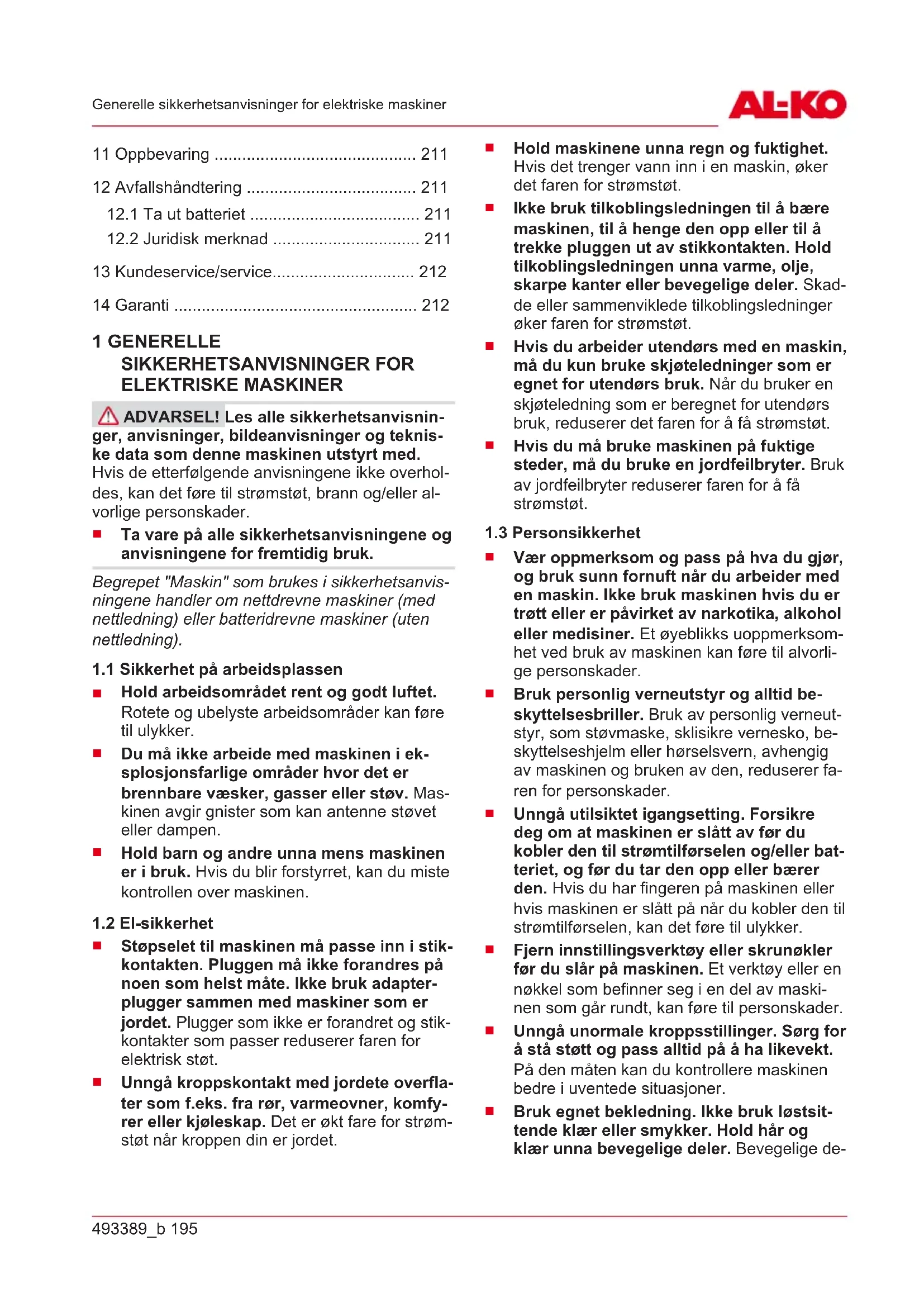 produsentens returmottak (hvis denne ikke er en del av det felles retursystemet) Dette gjelder bare for batteripakker og batterier som er solgt i EU-landene og som underligger kravene i EU-direktivet 2006/66/EF. I landene utenfor Den europeiske union kan avvikende be- stemmelser for avfallsbehandling av batteripak- ker og batterier gjelde. 13 KUNDESERVICE/SERVICE Ved spørsmål om garanti, reparasjon eller reser- vedeler henvend deg til det nærmeste AL-KO- serviceverkstedet. Dette finner du på Internett på følgende adresse: www.al-ko.com/service-contacts 14 GARANTI Vi utbedrer eventuelle material- eller produksjonsfeil på maskinen innenfor den lovmessige foreldel- sesfristen for mangelskrav ved at vi velger å foreta en reparasjon eller levere et nytt produkt. Foreldel- sesfristen fastlegges ut fra gjeldende lovgivning i landet hvor maskinen ble kjøpt. Vår garanti gjelder kun ved: