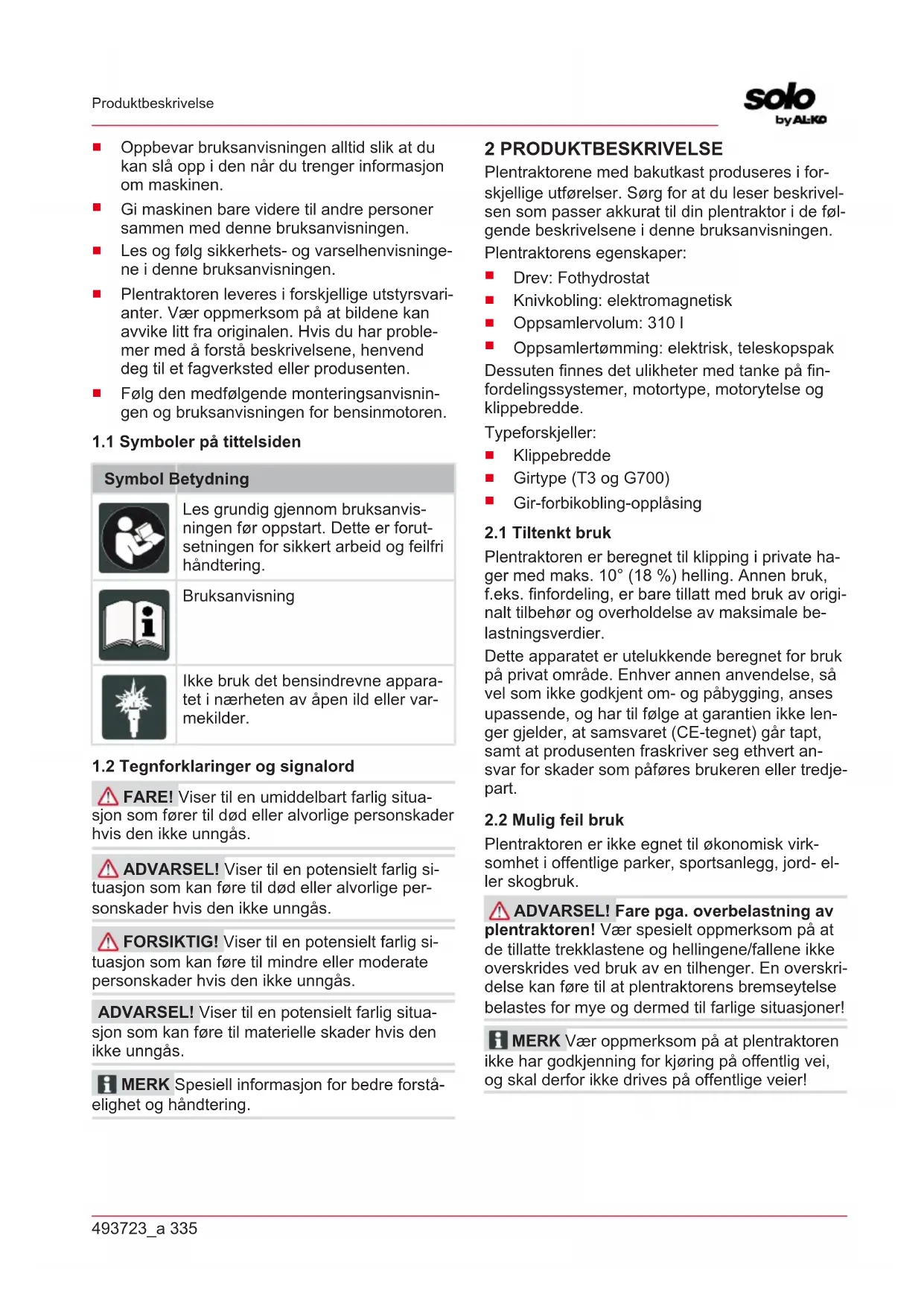 FARE! Viser til en umiddelbart farlig situa- sjon som fører til død eller alvorlige personskader hvis den ikke unngås. ADVARSEL! Viser til en potensielt farlig si- tuasjon som kan føre til død eller alvorlige per- sonskader hvis den ikke unngås. FORSIKTIG! Viser til en potensielt farlig si- tuasjon som kan føre til mindre eller moderate personskader hvis den ikke unngås. ADVARSEL! Viser til en potensielt farlig situa- sjon som kan føre til materielle skader hvis den ikke unngås. MERK Spesiell informasjon for bedre forstå- elighet og håndtering. 2 PRODUKTBESKRIVELSE Plentraktorene med bakutkast produseres i for- skjellige utførelser. Sørg for at du leser beskrivel- sen som passer akkurat til din plentraktor i de føl- gende beskrivelsene i denne bruksanvisningen. Plentraktorens egenskaper: