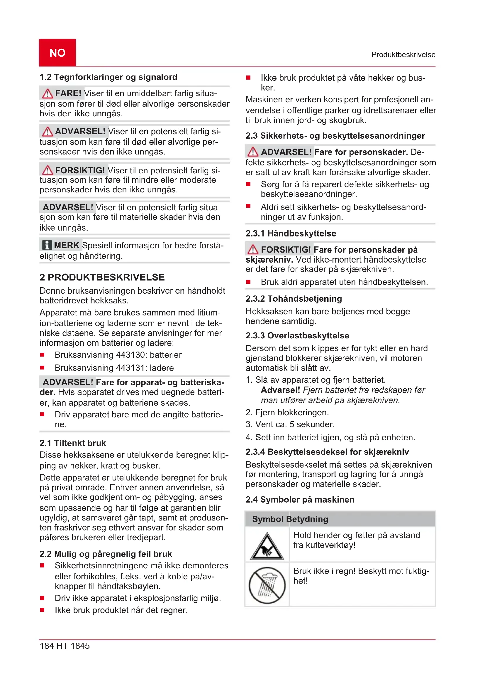 Ikke bruk produktet på våte hekker og bus- ker. Maskinen er verken konsipert for profesjonell an- vendelse i offentlige parker og idrettsarenaer eller til bruk innen jord- og skogbruk.
