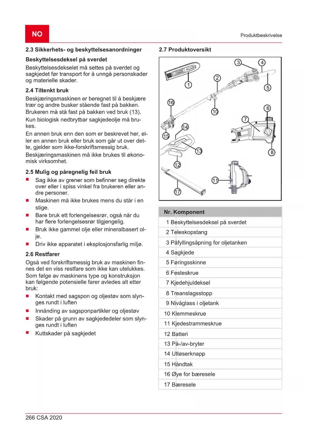 sverdet med en flatfil.NO 276 CSA 2020 Oppbevaring 9 OPPBEVARING Etter bruk skal maskinen rengjøres grundig, og – hvis montert – sett på alle beskyttelsesdekslene igjen. Oppbevar maskinen på et tørt sted som kan låses og som er utenfor rekkevidden til barn. Gjennomfør følgende arbeider før driftspauser som varer lenger enn 30 dager: