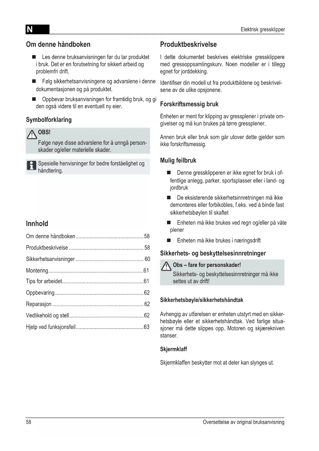 - Hjelp ved funksjonsfeil Om denne håndboken Les denne bruksanvisningen før du tar produktet i bruk. Det er en forutsetning for sikkert arbeid og problemfri drift. Følg sikkerhetsanvisningene og advarslene i denne dokumentasjonen og på produktet. Oppbevar bruksanvisningen for framtidig bruk, og gi den også videre til en eventuell ny eier. Symbolforklaring OBS! Følge nøye disse advarslene for å unngå person- skader og/eller materielle skader. Spesielle henvisninger for bedre forståelighet og håndtering. Produktbeskrivelse I dette dokumentet beskrives elektriske gressklippere med gressoppsamlingskurv. Noen modeller er i tillegg egnet for jorddekking. Identiserdinmodellutfraproduktbildeneogbeskrivel- sene av de ulike opsjonene. Forskriftsmessig bruk Enheten er ment for klipping av gressplener i private om- givelser og må kun brukes på tørre gressplener. Annen bruk eller bruk som går utover dette gjelder som ikke forskriftsmessig. Mulig feilbruk Denne gressklipperen er ikke egnet for bruk i of- fentlige anlegg, parker, sportsplasser eller i land- og jordbruk De eksisterende sikkerhetsinnretningen må ikke demonteres eller forbikobles, f.eks. ved å binde fast sikkerhetsbøylen til skaftet Enheten må ikke brukes ved regn og/eller på våte plener Enheten må ikke brukes i næringsdrift Sikkerhets- og beskyttelsesinnretninger Obs – fare for personskader! Sikkerhets- og beskyttelsesinnretninger må ikke settes ut av drift! Sikkerhetsbøyle/sikkerhetshåndtak Avhengig av utførelsen er enheten utstyrt med en sikker- hetsbøyle eller et sikkerhetshåndtak. Ved farlige situa- sjoner må dette slippes opp. Motoren og skjærekniven stanser. Skjermklaff Skjermklaffen beskytter mot at deler kan slynges ut.N p. 63