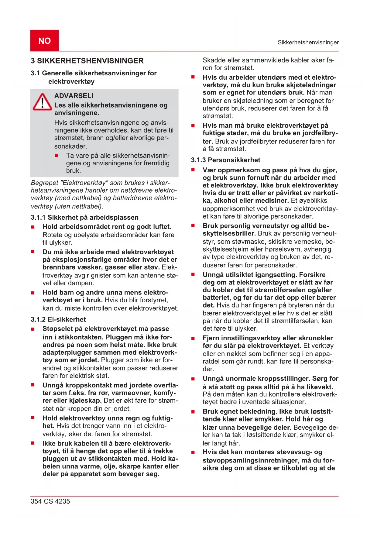 elektroverktøy ADVARSEL! Les alle sikkerhetsanvisningene og anvisningene. Hvis sikkerhetsanvisningene og anvis- ningene ikke overholdes, kan det føre til strømstøt, brann og/eller alvorlige per- sonskader.