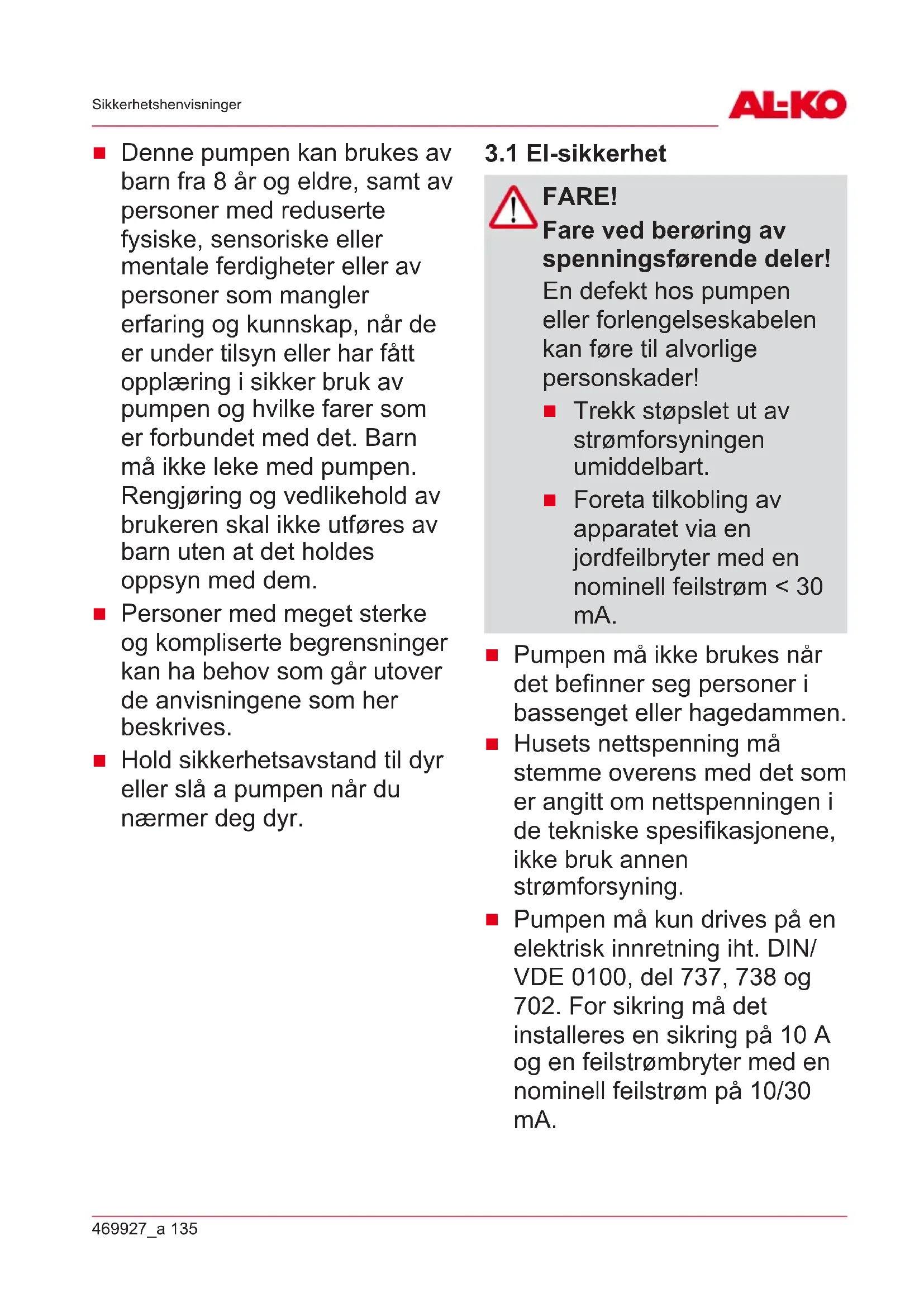 Feil i det elektriske anlegget må repareres av en kvalifisert elektriker. Feil Mulig årsak Hjelp Motoren går ikke. Pumpehjul blokkert. Fjern smuss i innsugingsområ det. Rengjør med egnet verktøy gjennom åpningen i motorhuset bak. Termobrytere n har koblet seg ut. Vent til termobryteren slår på pumpen igjen. Vær oppmerksom på maksimumstem peraturen til transportmediet. Sørg for at pumpen blir sjekket. Ingen nettspenning. Kontroller sikringer, sørg for at strømforsyninge n bli kontrollert av kvalifisert elektriker. Flottørbryter slår seg ikke på stigende vannstand. Send pumpen til et AL-KO servicesenter. Pumpen går, men den transporterer ikke. Luft i pumpehuset. Luft pumpen ved å holde den på skrå. Blokkering på sugesiden. Fjern smuss i innsugingsområ det. Trykkledning stengt. Åpne trykkledningen. Trykkslangen har en knekk. Strekk ut trykkslangen.469927_a 139 Kundeservice/service Feil Mulig årsak Hjelp For liten transportme ngde For liten slangediamet er. Bruk en større trykkslange. Blokkering på sugesiden. Fjern smuss i innsugingsområ det. Transporthøy den er for stor. Vær oppmerksom på maks. transporthøyde, se tekniske spesifikasjoner! MERK Ved feil som det ikke er mulig å utbedre, henvender du deg til vår kundeservice. 11 KUNDESERVICE/SERVICE Ved spørsmål om garanti, reparasjon eller reservedeler henvend deg til det nærmeste AL- KO-serviceverkstedet. Dette finner du på Internett på følgende adresse: www.al-ko.com/service-contactsNO