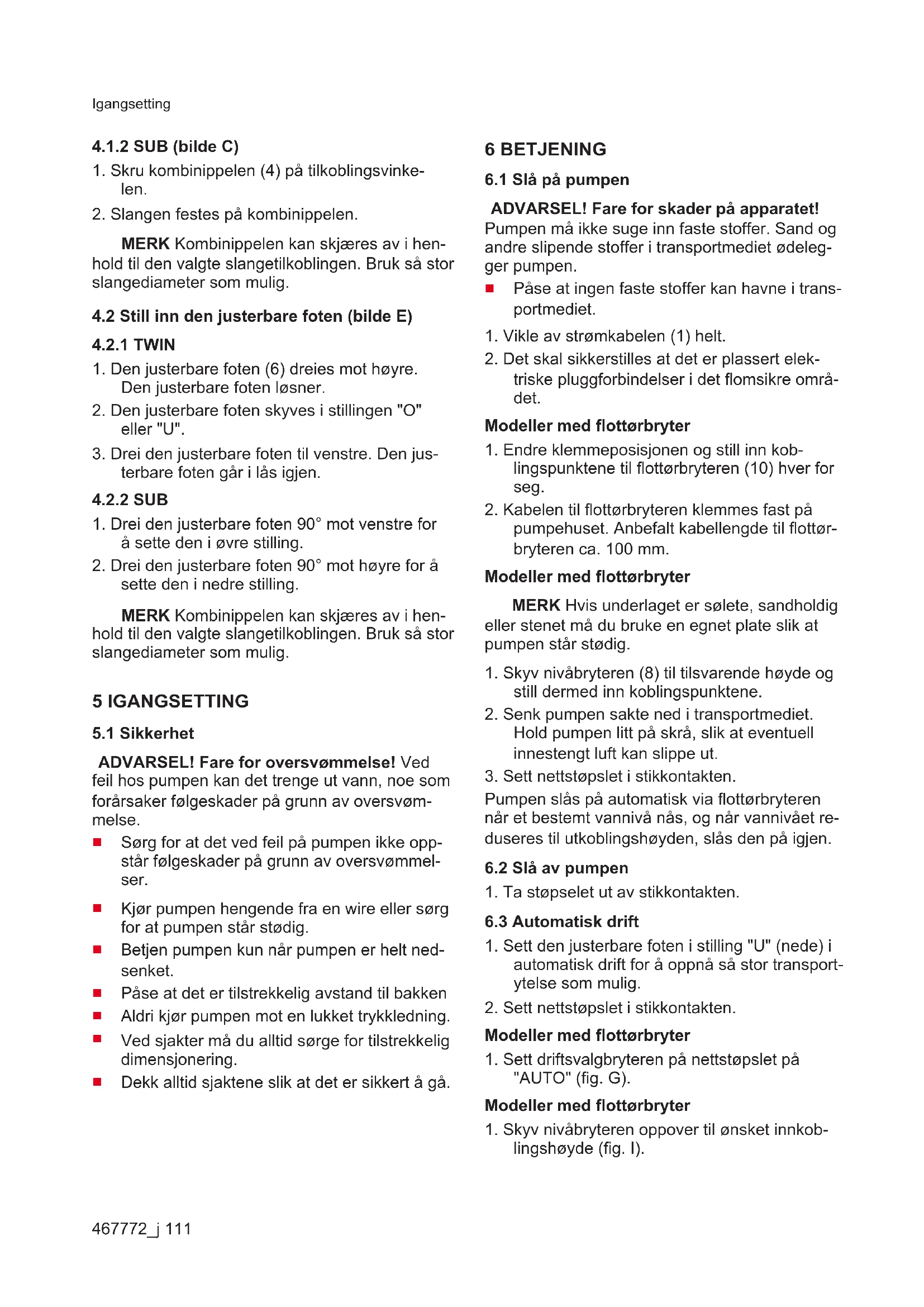Pumpen er utstyrt med termovern som slår av motoren hvis den overopphetes. Etter en avkjø- lingsperiode på ca. 15 - 20 minutter, slår pumpen seg automatisk på igjen. Betjen pumpen kun når den er helt nedsenket.