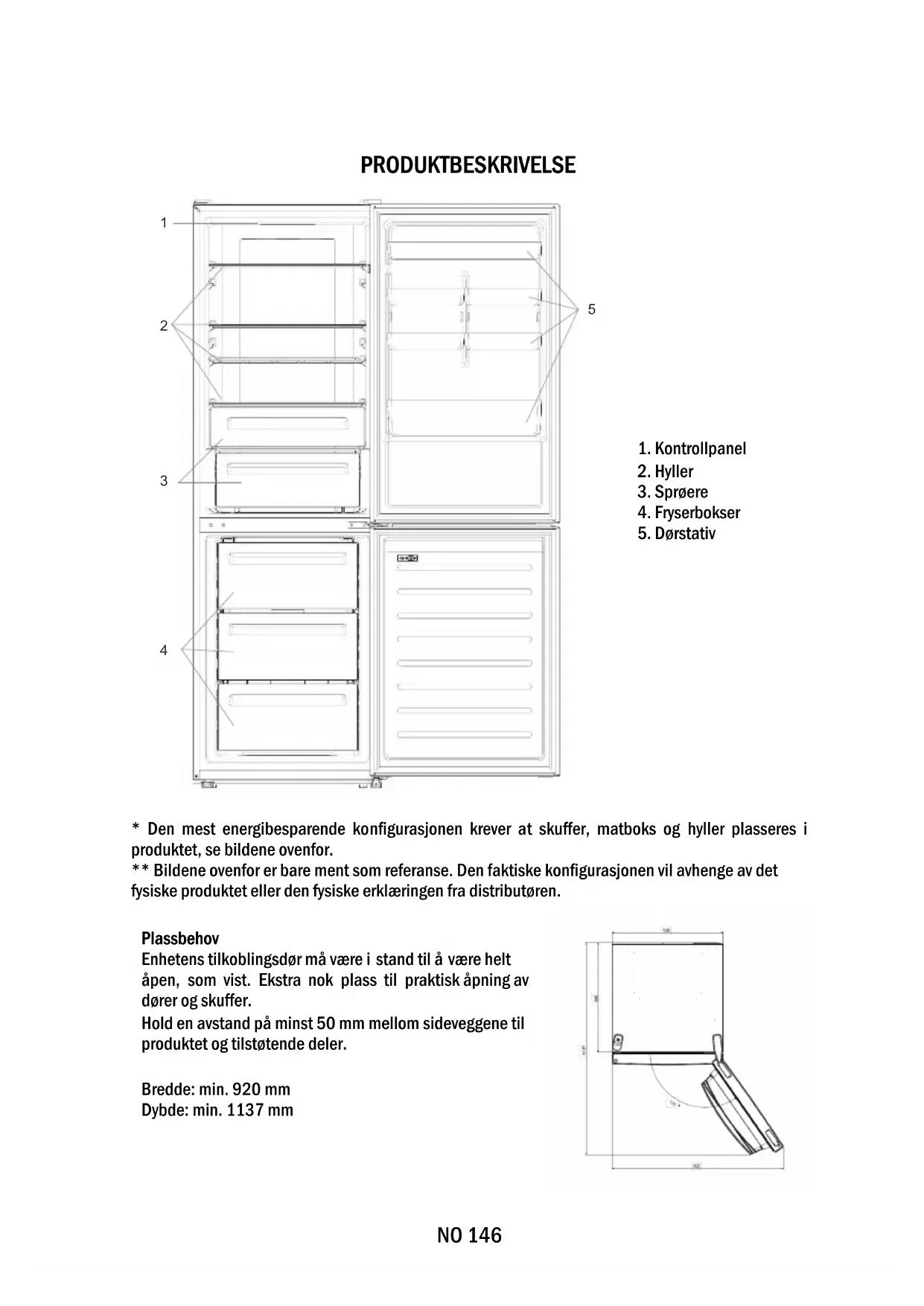 Plassbehov Enhetens tilkoblingsdør må være i stand til å være helt åpen, som vist. Ekstra nok plass til praktisk åpning av dører og skuffer. Hold en avstand på minst 50 mm mellom sideveggene til produktet og tilstøtende deler. Bredde: min. 920 mm Dybde: min. 1137 mmNO 147 BRUK A. AV/PÅ-tasten, brukes til å slå apparatet av/på. B. Wi-Fi-nøkkel, brukes til å slå av/på Wi-Fi-nøkkelen C. Mode-tasten, brukes til å velge ønsket funksjon D. TEMP-tasten, brukes til å velge kjøle- og frysetemperaturen a. Kjøleskap/fryser-områdeikon, viser hvilket rom av apparatet som er valgt b. Super Freeze-ikonet viser om super frysing-funksjonen er aktivert c. Frysertemperaturnivåer viser den valgte temperaturen i fryseren d. Super Cool-ikon viser om super kjøling-funksjonen er aktivert. e. Kjøleskaptemperaturnivåer, viser den valgte temperaturen f. Tilpasset temperatur-ikon viser om temperaturen er valgt av appen g. Øko-modusikon viser om økomodus er aktivert h. Feriefunksjon-ikon viser om feriefunksjonen er aktivert