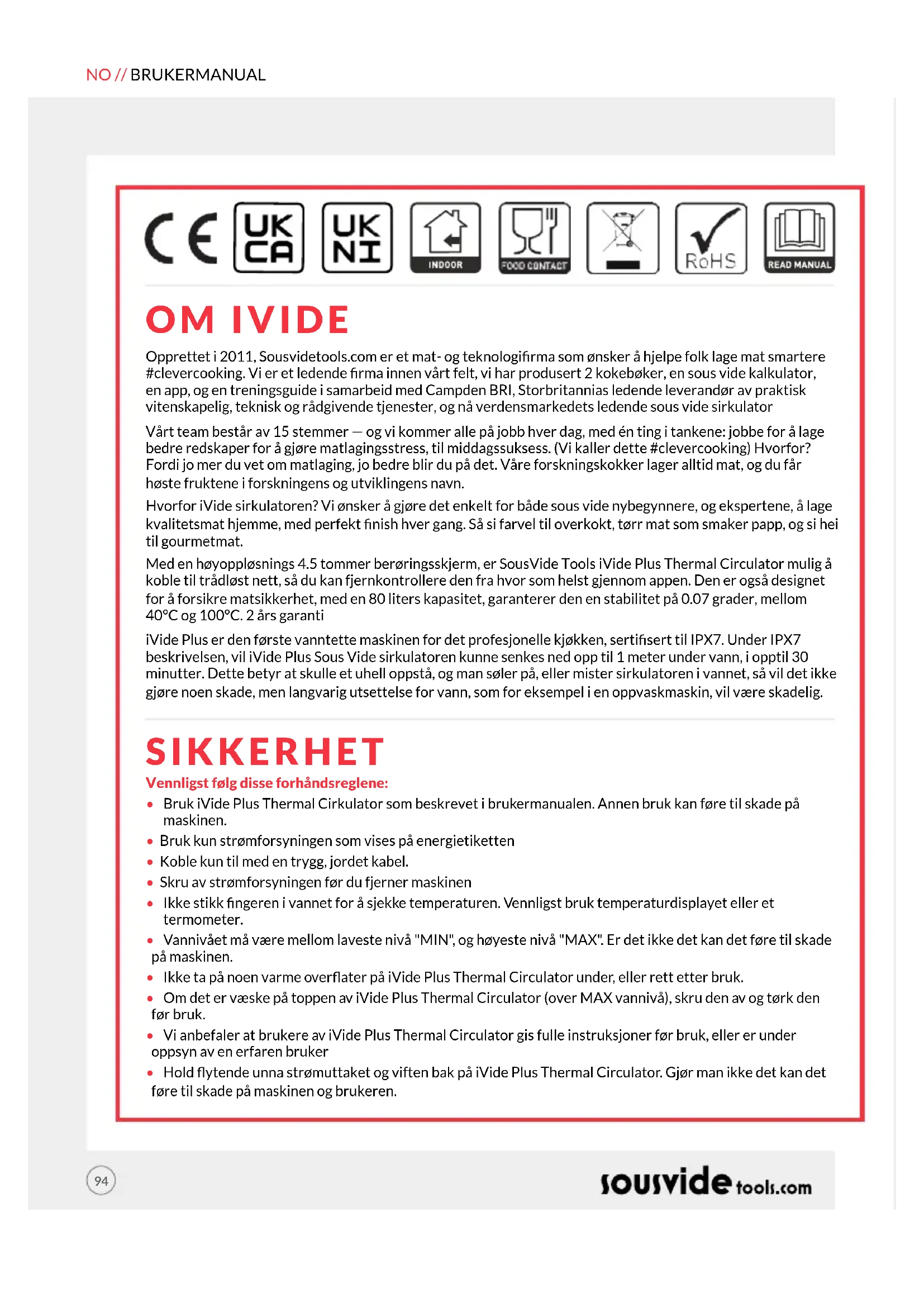 Datum / Plaats Naam: Alex Shannon Functie: Algemeen directeur NL// GEBRUIKERSHANDLEIDING94 OM IVIDE SIKKERHET Opprettet i 2011, Sousvidetools.com er et mat- og teknologirma som ønsker å hjelpe folk lage mat smartere #clevercooking. Vi er et ledende rma innen vårt felt, vi har produsert 2 kokebøker, en sous vide kalkulator, en app, og en treningsguide i samarbeid med Campden BRI, Storbritannias ledende leverandør av praktisk vitenskapelig, teknisk og rådgivende tjenester, og nå verdensmarkedets ledende sous vide sirkulator Vårt team består av 15 stemmer — og vi kommer alle på jobb hver dag, med én ting i tankene: jobbe for å lage bedre redskaper for å gjøre matlagingsstress, til middagssuksess. (Vi kaller dette #clevercooking) Hvorfor? Fordi jo mer du vet om matlaging, jo bedre blir du på det. Våre forskningskokker lager alltid mat, og du får høste fruktene i forskningens og utviklingens navn. Hvorfor iVide sirkulatoren? Vi ønsker å gjøre det enkelt for både sous vide nybegynnere, og ekspertene, å lage kvalitetsmat hjemme, med perfekt nish hver gang. Så si farvel til overkokt, tørr mat som smaker papp, og si hei til gourmetmat. Med en høyoppløsnings 4.5 tommer berøringsskjerm, er SousVide Tools iVide Plus Thermal Circulator mulig å koble til trådløst nett, så du kan fjernkontrollere den fra hvor som helst gjennom appen. Den er også designet for å forsikre matsikkerhet, med en 80 liters kapasitet, garanterer den en stabilitet på 0.07 grader, mellom 40°C og 100°C. 2 års garanti iVide Plus er den første vanntette maskinen for det profesjonelle kjøkken, sertisert til IPX7. Under IPX7 beskrivelsen, vil iVide Plus Sous Vide sirkulatoren kunne senkes ned opp til 1 meter under vann, i opptil 30 minutter. Dette betyr at skulle et uhell oppstå, og man søler på, eller mister sirkulatoren i vannet, så vil det ikke gjøre noen skade, men langvarig utsettelse for vann, som for eksempel i en oppvaskmaskin, vil være skadelig. Vennligst følg disse forhåndsreglene: