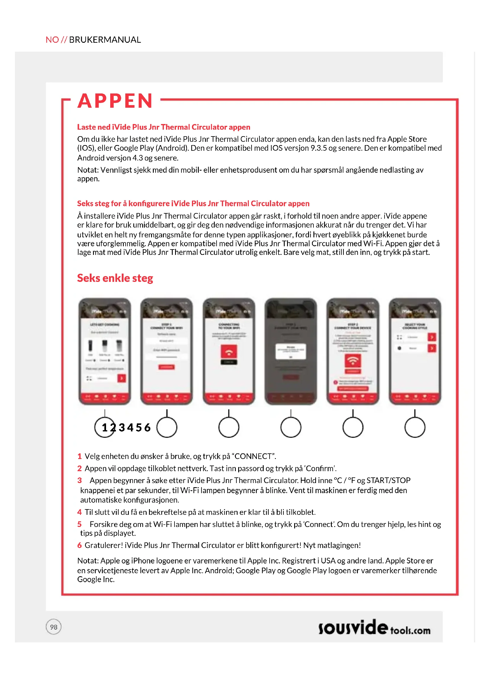- I arbeidsmodus vises gjenstående tid NO // BRUKERMANUAL97 PRODUKTSTRUKTUR NO // BRUKERMANUAL Kontrollpanel Håndter festeplaten Quick release skrue Vannuttak Front hoveddel Rør av rustfritt stål Vanninntak Bakre hoveddel Fast håndtak Håndtak98 APPEN Laste ned iVide Plus Jnr Thermal Circulator appen Om du ikke har lastet ned iVide Plus Jnr Thermal Circulator appen enda, kan den lasts ned fra Apple Store (IOS), eller Google Play (Android). Den er kompatibel med IOS versjon 9.3.5 og senere. Den er kompatibel med Android versjon 4.3 og senere. Notat: Vennligst sjekk med din mobil- eller enhetsprodusent om du har spørsmål angående nedlasting av appen. Seks steg for å kongurere iVide Plus Jnr Thermal Circulator appen Å installere iVide Plus Jnr Thermal Circulator appen går raskt, i forhold til noen andre apper. iVide appene er klare for bruk umiddelbart, og gir deg den nødvendige informasjonen akkurat når du trenger det. Vi har utviklet en helt ny fremgangsmåte for denne typen applikasjoner, fordi hvert øyeblikk på kjøkkenet burde være uforglemmelig. Appen er kompatibel med iVide Plus Jnr Thermal Circulator med Wi-Fi. Appen gjør det å lage mat med iVide Plus Jnr Thermal Circulator utrolig enkelt. Bare velg mat, still den inn, og trykk på start. Seks enkle steg 1 Velg enheten du ønsker å bruke, og trykk på “CONNECT”. 2 Appen vil oppdage tilkoblet nettverk. Tast inn passord og trykk på ‘Conrm’. 3 Appen begynner å søke etter iVide Plus Jnr Thermal Circulator. Hold inne °C / °F og START/STOP knappenei et par sekunder, til Wi-Fi lampen begynner å blinke. Vent til maskinen er ferdig med den automatiske kongurasjonen. 4 Til slutt vil du få en bekreftelse på at maskinen er klar til å bli tilkoblet. 5 Forsikre deg om at Wi-Fi lampen har sluttet å blinke, og trykk på ‘Connect’. Om du trenger hjelp, les hint og tips på displayet. 6 Gratulerer! iVide Plus Jnr Thermal Circulator er blitt kongurert! Nyt matlagingen! Notat: Apple og iPhone logoene er varemerkene til Apple Inc. Registrert i USA og andre land. Apple Store er en servicetjeneste levert av Apple Inc. Android; Google Play og Google Play logoen er varemerker tilhørende Google Inc.