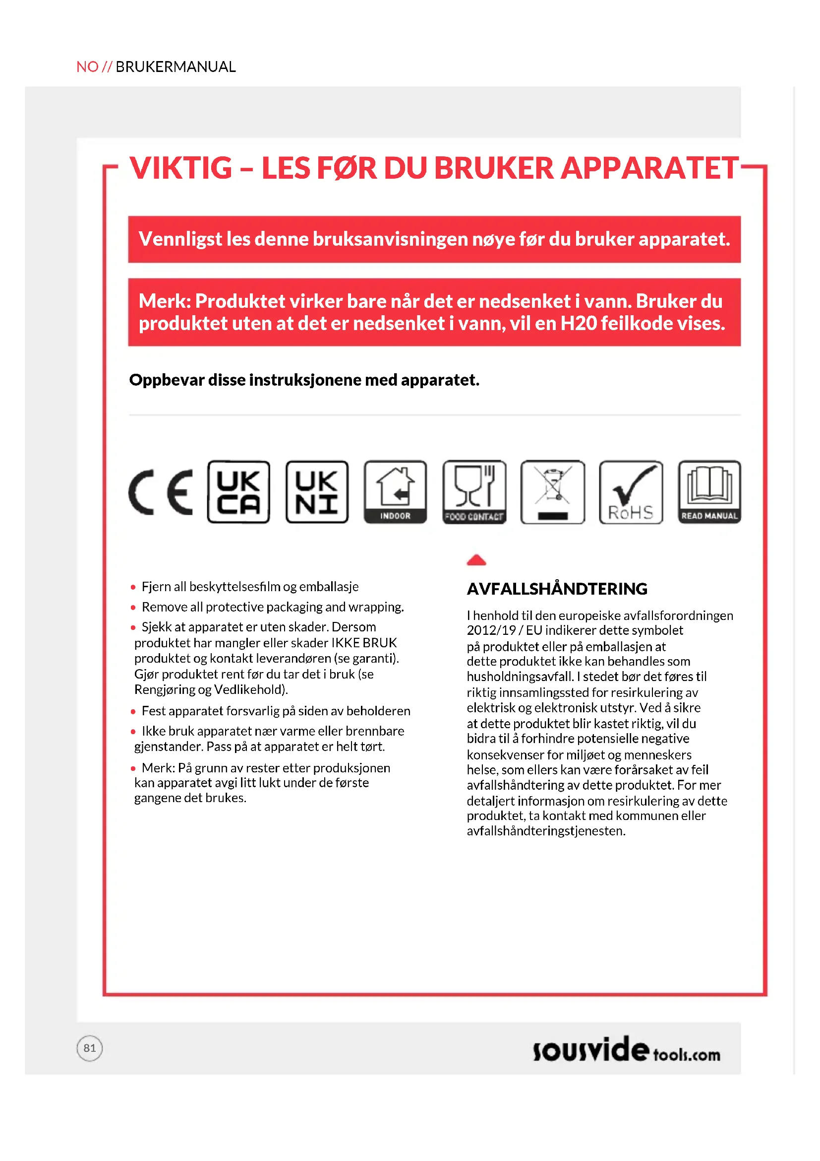 FORBEREDELSE: Mat eddik (hvit eddik, epleeddik, etc.) HVORFOR DU TRENGER Å RENGJØRE: Vann fra springen inneholder ofte mineraler som kan forårsake kalk. Når vannet blir varmet opp til en viss temperatur, vil kalken vises på varmeapparatet eller overaten på maskinen. Dette kan påvirke maskinens ytelse. Vi anbefaler at du rengjør maskinen etter hver 20. gangs bruk eller 200 timers bruk. SLIK RENGJØR DU: 1 Bland 75% vann og 25% eddik og hell det i en beholder til du når Max-linjen på maskinen. 2 Slå på maskinen, sett arbeidstemperaturen til 80 ° C / 176 ° F) og still inn tiden 3 timer (03:00), og trykk deretter på Start / Stop-knappen. Når maskinen når den forhåndsinnstilte temperaturen, trykker du på Start / Stop-knappen for å starte tidtakeren. 3 Når timeren indikerer 00:00, må du stoppe maskinen og slå av strømmen, trekke ut støpselet og la maskinen avkjøles. 4 Tøm vannet ut av beholderen, og bruk rent vann til rengjøring av enheten. NO // BRUKERMANUAL90 Enhver feil som påvirker apparatets funksjonalitet og som oppstår innen ett år etter kjøpet, vil bli reparartet gratis, forutsatt at apparatet har blitt brukt og vedlikeholdt i samsvar med instruksjonene og ikke på noen måte har blitt brukt feil. Dine lovbestemte rettigheter påvirkes ikke. Hvis garantien benyttes, oppgi hvor og når apparatet ble kjøpt, og ta med kjøpsbevis (f.eks. Kvittering). I tråd med vår policy om kontinuerlig produktutvikling forbeholder vi oss retten til å endre spesikasjoner for produkt, emballasje og dokumentasjon uten varsel GARANTI TEKNISKE SPESIFIKASJONER Driftsspenning og frekvens: 220 - 240V ~ 50Hz Nominell inngangseffekt: 1200W Grad av vanntetthet: IPX7 Temperaturområde: 5 ° C ~ 90 ° C Nettverksdetaljer: Kompatible standarder: IEEE 802.11 b / g / n Frekvensbånd: 2,412 MHz -2,484 MHz Driftsfrekvens / Maks utgangseffekt: 2,412 MHz - 2,484 MHz / <20,0 dB Ved slutten av apparatets levetid, må du kaste apparatet i henhold til gjeldende forskrifter og retningslinjer. Emballasjematerialet skal sorteres som plast og eskene skal kastes i riktige avfallsbeholdere.