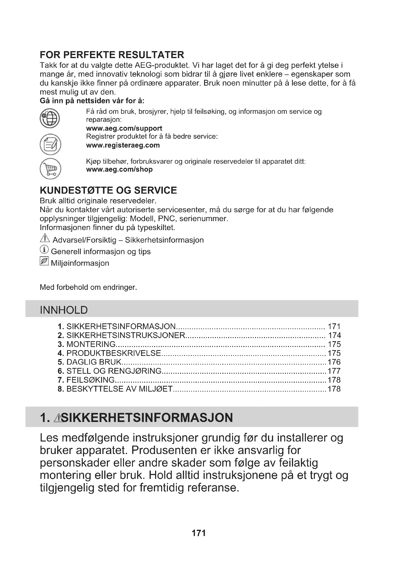 Takk for at du valgte dette AEG-produktet. Vi har laget det for å gi deg perfekt ytelse imange år, med innovativ teknologi som bidrar til å gjøre livet enklere – egenskaper somdu kanskje ikke finner på ordinære apparater. Bruk noen minutter på å lese dette, for å fåmest mulig ut av den.Gå inn på nettsiden vår for å:Få råd om bruk, brosjyrer, hjelp til feilsøking, og informasjon om service ogreparasjon:www.aeg.com/supportRegistrer produktet for å få bedre service:www.registeraeg.comKjøp tilbehør, forbruksvarer og originale reservedeler til apparatet ditt:www.aeg.com/shop