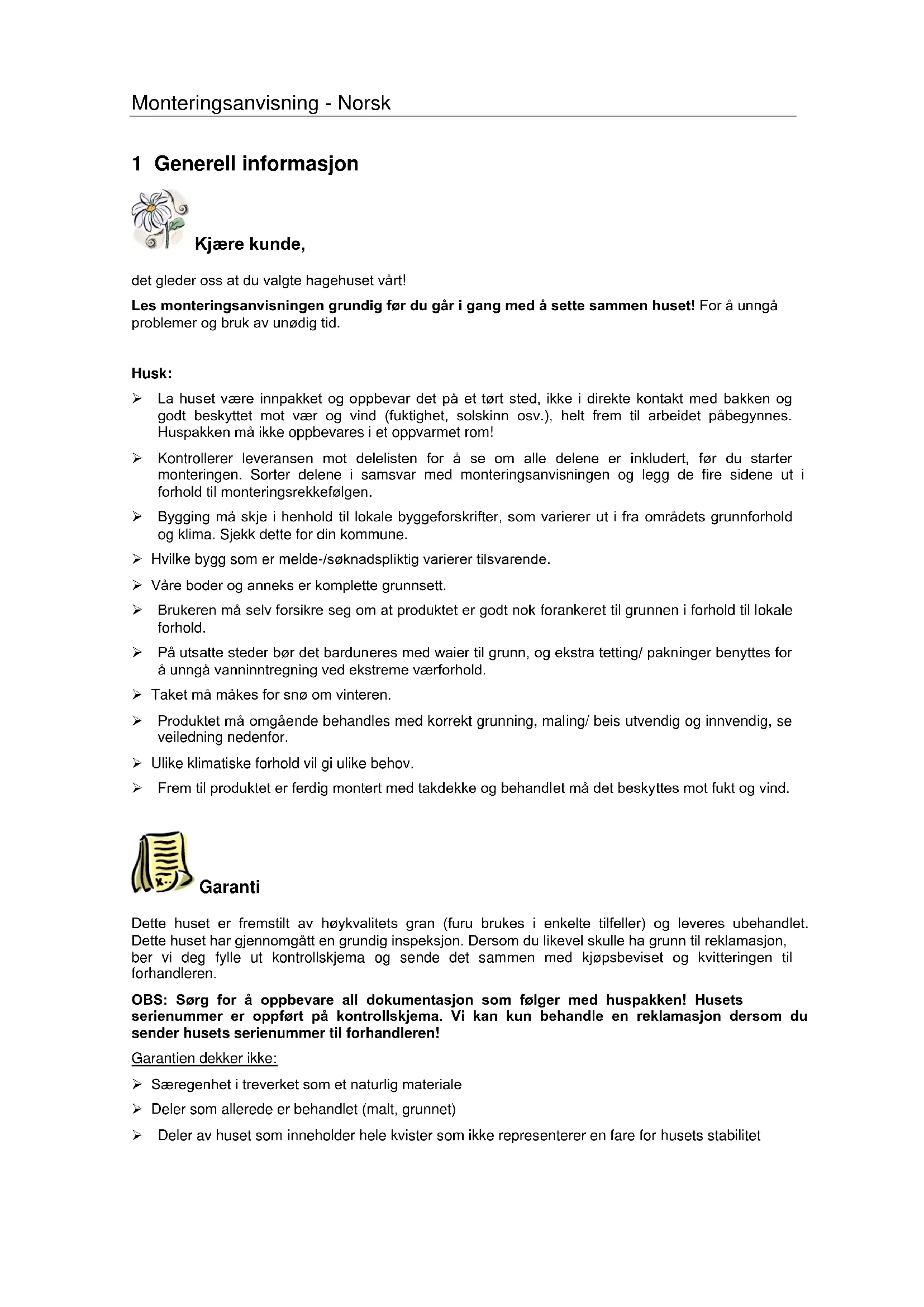 1 Generell informasjon Kjære kunde, det gleder oss at du valgte hagehuset vårt! Les monteringsanvisningen grundig før du går i gang med å sette sammen huset! For å unngå problemer og bruk av unødig tid. Husk: ➢ La huset være innpakket og oppbevar det på et tørt sted, ikke i direkte kontakt med bakken og godt beskyttet mot vær og vind (fuktighet, solskinn osv.), helt frem til arbeidet påbegynnes. Huspakken må ikke oppbevares i et oppvarmet rom! ➢ Kontrollerer leveransen mot delelisten for å se om alle delene er inkludert, før du starter monteringen. Sorter delene i samsvar med monteringsanvisningen og legg de fire sidene ut i forhold til monteringsrekkefølgen. ➢ Bygging må skje i henhold til lokale byggeforskrifter, som varierer ut i fra områdets grunnforhold og klima. Sjekk dette for din kommune. ➢ Hvilke bygg som er melde-/søknadspliktig varierer tilsvarende. ➢ Våre boder og anneks er komplette grunnsett. ➢ Brukeren må selv forsikre seg om at produktet er godt nok forankeret til grunnen i forhold til lokale forhold. ➢ På utsatte steder bør det barduneres med waier til grunn, og ekstra tetting/ pakninger benyttes for å unngå vanninntregning ved ekstreme værforhold. ➢ Taket må måkes for snø om vinteren. ➢ Produktet må omgående behandles med korrekt grunning, maling/ beis utvendig og innvendig, se veiledning nedenfor. ➢ Ulike klimatiske forhold vil gi ulike behov. ➢ Frem til produktet er ferdig montert med takdekke og behandlet må det beskyttes mot fukt og vind. Garanti Dette huset er fremstilt av høykvalitets gran (furu brukes i enkelte tilfeller) og leveres ubehandlet. Dette huset har gjennomgått en grundig inspeksjon. Dersom du likevel skulle ha grunn til reklamasjon, ber vi deg fylle ut kontrollskjema og sende det sammen med kjøpsbeviset og kvitteringen til forhandleren. OBS: Sørg for å oppbevare all dokumentasjon som følger med huspakken! Husets serienummer er oppført på kontrollskjema. Vi kan kun behandle en reklamasjon dersom du sender husets serienummer til forhandleren! Garantien dekker ikke: ➢ Særegenhet i treverket som et naturlig materiale ➢ Deler som allerede er behandlet (malt, grunnet) ➢ Deler av huset som inneholder hele kvister som ikke representerer en fare for husets stabilitetMonteringsanvisning - Norsk