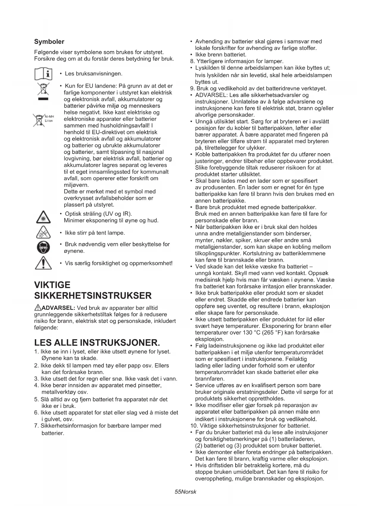 - Før du bruker batteriet må du lese alle instruksjoner og forsiktighetsmerkinger på (1) batteriladeren, (2) batteriet og (3) produktet som bruker batteriet.