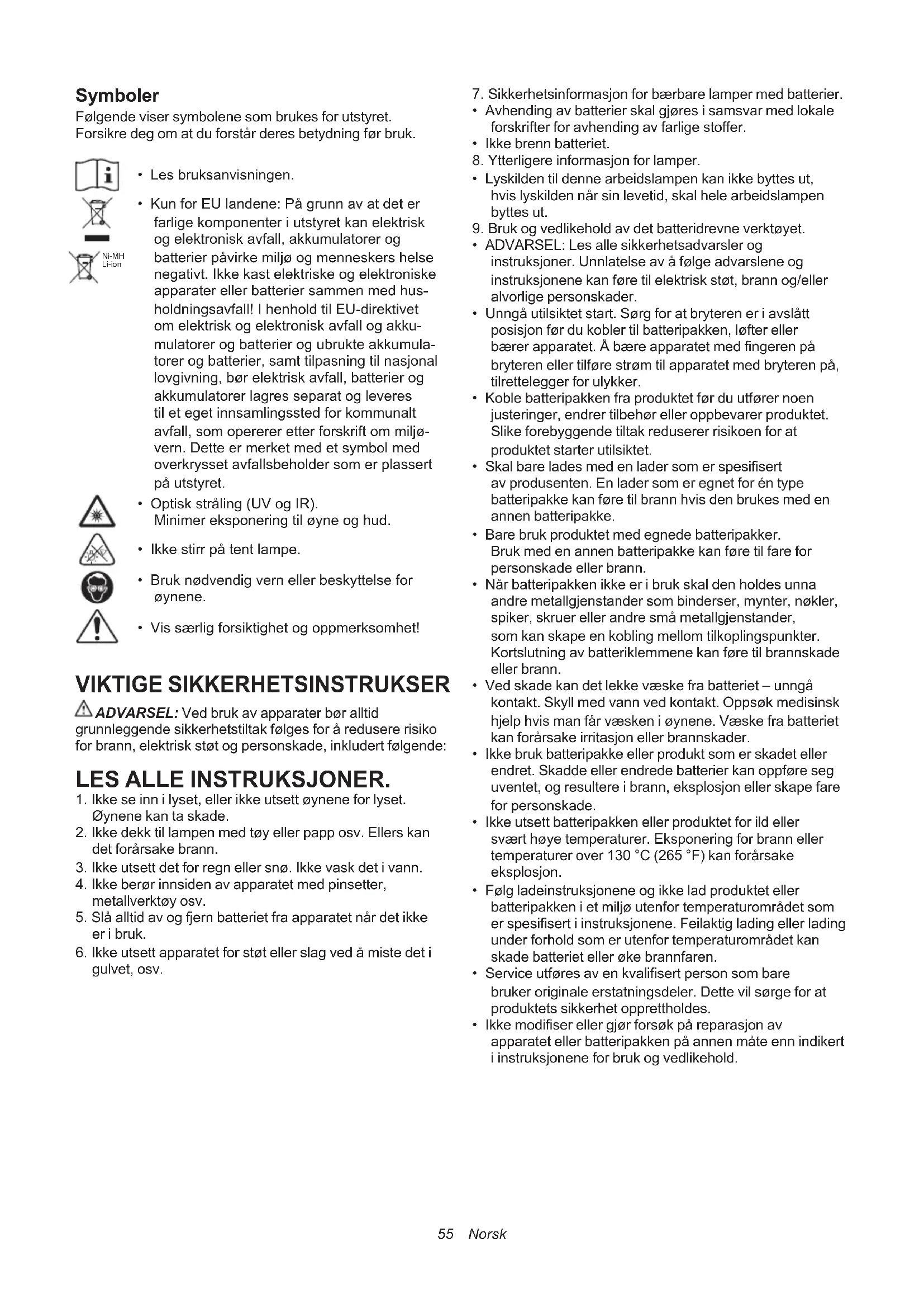 - Før du bruker batteriet må du lese alle instruksjoner og forsiktighetsmerkinger på (1) batteriladeren, (2) batteriet og (3) produktet som bruker batteriet.