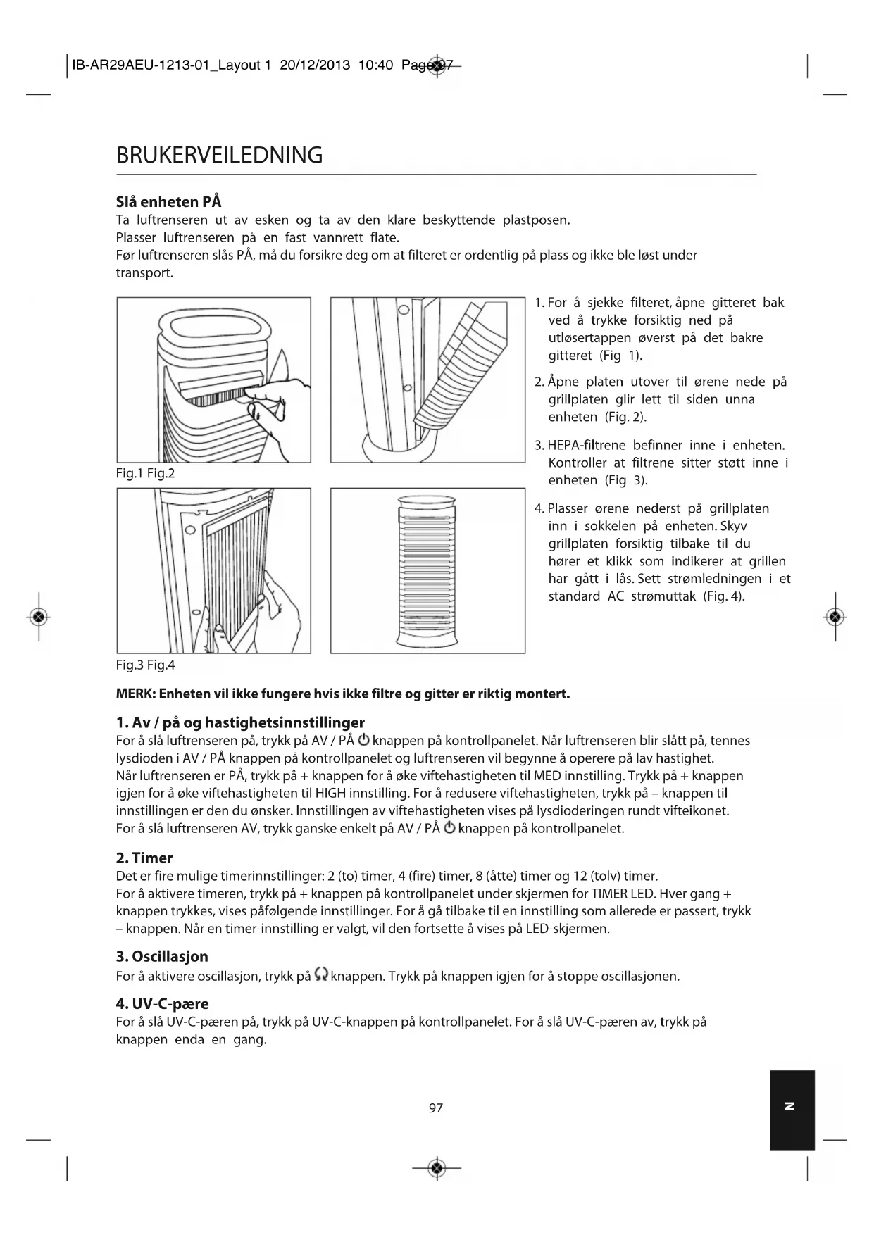 - Luftrenseren skal alltid plugges direkte i en veggkontakt/stikkontakt. Apparatet skal aldri brukes med skjøteledning. TA VARE PÅ DISSE VIKTIGE INSTRUKSJONENE FOR LETTVINN REFERANSE Tekniske spesifikasjoner T Dette apparatet er klassifisert som egnet for bruk i tropisk klima med en omgivelsestemperatur opp til 40 °C. WEEE forklaring Denne merkingen indikerer at innen EU skal dette produktet ikke kastes sammen med annet husholdningssøppel. For å forebygge mulig skade på miljøet eller menneskelig helse forårsaket av ukontrollert avfallstømming, skal produktet gjenvinnes ansvarlig for å støtte holdbar gjenbruk av materialressurser. For å returnere den brukte anordningen, vennligst bruk retur- og hentesystemet, eller ta kontakt med detaljisten hvor produktet ble kjøpt. De kan sørge for miljøvennlig gjenvinning av produktet. Batteridirektiv Dette symbolet indikerer at batteriene ikke skal kastes sammen med husholdningsavfall da de inneholder substanser som kan skade miljøet og helsen. Vær vennlig å ta batterier til et designert innsamlingspunkt. Inngangsspenning 220-240 V Nominell frekvens 50-60 Hz Strøm 65 Watts Vekt 5.67kg Støynivå <60 dB Høyde på enhet 71.12cm IB-AR29AEU-1213-01_Layout 1 20/12/2013 10:40 Page 9596