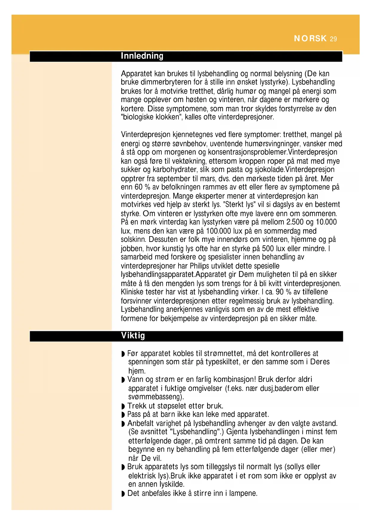 molti anni), si dovrà procedere alla loro sostituzione. Le lampade devono essere sostituite presso un Centro Autorizzato Philips in quanto sono necessari utensili e/o pezzi speciali. Le lampade devono essere sostituite sempre con ricambi originali Philips - lampade Bright Light PL-L 36W Cavo di alimentazione Nel caso in cui il cavo di alimentazione fosse danneggiato, dovrà essere sostituito esclusivamente presso un Centro Assistenza Philips o un rivenditore autorizzato, in quanto sono necessari utensili e/o pezzi speciali. ITALIANO 27Ambiente Le lampade contengono sostanze che possono inquinare l'ambiente. Quando dovrete gettare le vecchie lampade, assicuratevi di tenerle separate dai normali rifiuti domestici e di gettarle presso un punto di raccolta differenziato. Garanzia e assistenza Questo apparecchio è conforme alle norme MDD 93/42/EEC per gli apparecchi medici. Per ulteriori informazioni o in caso di dubbio, vi preghiamo di visitare il sito Philips www.philips.com oppure contattate il Centro Assistenza Clienti del vostro Paese (per conoscere il numero, consultate l'opuscolo della garanzia). Qualora nel vostro Paese non esista un Centro Assistenza Clienti, rivolgetevi al rivenditore Philips più vicino oppure contattate il Service Department of Philips Domestic Appliances and Personal Care BV. ITALIANO28Innledning Apparatet kan brukes til lysbehandling og normal belysning (De kan bruke dimmerbryteren for å stille inn ønsket lysstyrke). Lysbehandling brukes for å motvirke tretthet, dårlig humør og mangel på energi som mange opplever om høsten og vinteren, når dagene er mørkere og kortere. Disse symptomene, som man tror skyldes forstyrrelse av den "biologiske klokken", kalles ofte vinterdepresjoner. Vinterdepresjon kjennetegnes ved flere symptomer: tretthet, mangel på energi og større søvnbehov, uventende humørsvingninger, vansker med å stå opp om morgenen og konsentrasjonsproblemer.Vinterdepresjon kan også føre til vektøkning, ettersom kroppen roper på mat med mye sukker og karbohydrater, slik som pasta og sjokolade.Vinterdepresjon opptrer fra september til mars, dvs. den mørkeste tiden på året. Mer enn 60 % av befolkningen rammes av ett eller flere av symptomene på vinterdepresjon. Mange eksperter mener at vinterdepresjon kan motvirkes ved hjelp av sterkt lys. "Sterkt lys" vil si dagslys av en bestemt styrke. Om vinteren er lysstyrken ofte mye lavere enn om sommeren. På en mørk vinterdag kan lysstyrken være på mellom 2.500 og 10.000 lux, mens den kan være på 100.000 lux på en sommerdag med solskinn. Dessuten er folk mye innendørs om vinteren, hjemme og på jobben, hvor kunstig lys ofte har en styrke på 500 lux eller mindre. I samarbeid med forskere og spesialister innen behandling av vinterdepresjoner har Philips utviklet dette spesielle lysbehandlingsapparatet.Apparatet gir Dem muligheten til på en sikker måte å få den mengden lys som trengs for å bli kvitt vinterdepresjonen. Kliniske tester har vist at lysbehandling virker. I ca. 90 % av tilfellene forsvinner vinterdepresjonen etter regelmessig bruk av lysbehandling. Lysbehandling anerkjennes vanligvis som en av de mest effektive formene for bekjempelse av vinterdepresjon på en sikker måte. Viktig ◗ Før apparatet kobles til strømnettet, må det kontrolleres at spenningen som står på typeskiltet, er den samme som i Deres hjem. ◗ Vann og strøm er en farlig kombinasjon! Bruk derfor aldri apparatet i fuktige omgivelser (f.eks. nær dusj,baderom eller svømmebasseng). ◗ Trekk ut støpselet etter bruk. ◗ Pass på at barn ikke kan leke med apparatet. ◗ Anbefalt varighet på lysbehandling avhenger av den valgte avstand. (Se avsnittet "Lysbehandling".) Gjenta lysbehandlingen i minst fem etterfølgende dager, på omtrent samme tid på dagen. De kan begynne en ny behandling på fem etterfølgende dager (eller mer) når De vil. ◗ Bruk apparatets lys som tilleggslys til normalt lys (sollys eller elektrisk lys).Bruk ikke apparatet i et rom som ikke er opplyst av en annen lyskilde. ◗ Det anbefales ikke å stirre inn i lampene. NORSK 29◗ Etter bruk av apparatet de første gangene kan øynene føles stresset og/eller en lett hodepine kan forekomme.Vanligvis vil disse bivirkningene forsvinne raskt. ◗ Rådfør Dem med lege før bruk i følgende tilfeller: - De lider av eller har lidd av alvorlig depresjon; - De er overfølsom for lys (f.eks. diabetikere og epileptikere); - De har øyelidelser; - hvis De bruker spesielle antidepressive medisiner eller andre medisinermot psykiske lidelser eller epilepsi; - De har høyt blodtrykk. ◗ Hvis bruk av apparatet øker Deres aktivitet for mye, anbefaler vi at De reduserer lysbehandlingen.Hvis dette ikke fører til noen forbedring,anbefaler vi Dem å ta kontakt med lege. ◗ Hvis De føler Dem utslitt, bedrøvet eller urolig og/eller lider av søvnproblemer (insomnia),er det å anbefale at De tar kontakt med lege eller psykolog. Klargjøring før bruk 1 Sett apparatet på et bord.
