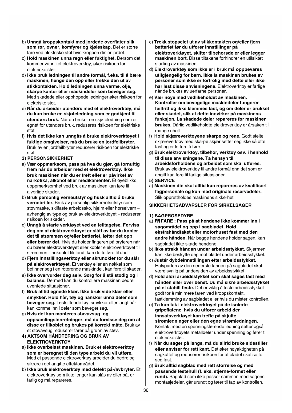 - Tilbakeslag er en følge av at verktøyet misbrukes og/eller betjenes på feil måte eller under forhold som ikke egner seg; tilbakeslag kan unngås ved å ta riktige forholdsregler som oppgitt nedenfor a) Hold sagen støtt med begge hendene og hold armene slik at du kan stå i mot kraften av tilbakeslaget. Stå slik at kroppen kommer på den ene eller andre siden av bladet, og ikke på linje med bladet. Tilbakeslag kan få sagen til å hoppe bakover, men kraften i tilbakeslaget kan styres av operatøren, dersom du tar skikkelige forholdsregler. b) Når bladet kjører seg fast, eller når du av en eller annen grunn avbryter sagingen, frigjør bryteren og hold sagen helt stille i arbeidsstykket til bladet slutter helt å gå rundt. Forsøk aldri å trekke sagen ut av arbeidsstykket eller trekke sagen bakover mens bladet ennå roterer, eller kan det forårsake tilbakeslag. Undersøk hvorfor bladet har kjørt seg fast og fjern årsaken til det. Unngå å skjære over nagler eller skruer. c) Når du starter sagen igjen i arbeidsstykket, sett sagbladet midt i spaltekniven og kontroller at sagtennene ikke biter inn i materialet. Hvis sagbladet sitter fast, kan det bevege seg oppover eller slå tilbake fra arbeidsstykket i det sagen startes på nytt. d) Støtt større paneler for å redusere risikoen for tilbakeslag eller at bladet blir klemt fast. Store paneler har en tendens til å bøye seg under sin egen vekt. Det er nødvendig å sette støtter under panelet på begge sider, like ved skjærelinjen og nær kanten av panelet. e) Ikke bruk et sagblad som er sløvt eller skadet. Blad som er uslipte eller ikke skikkelig justert, kan gi smal spaltekniv som forårsaker for mye friksjon, samt tilbakeslag og tendens til at bladet setter seg fast. f) Bladdybde og låsespaker for skråsaging må trekkes godt til og være støe før man begynner kuttet. Hvis bladjusteringen endrer seg under sagingen, kan det forårsake tilbakeslag eller at bladet setter seg fast. g) Vær spesielt forsiktig ved saging i vegger eller andre uoversiktelige områder. Det innstikkende sagbladet kan blokkere ved saging i skjulte objekter og forårsake et tilbakeslag.