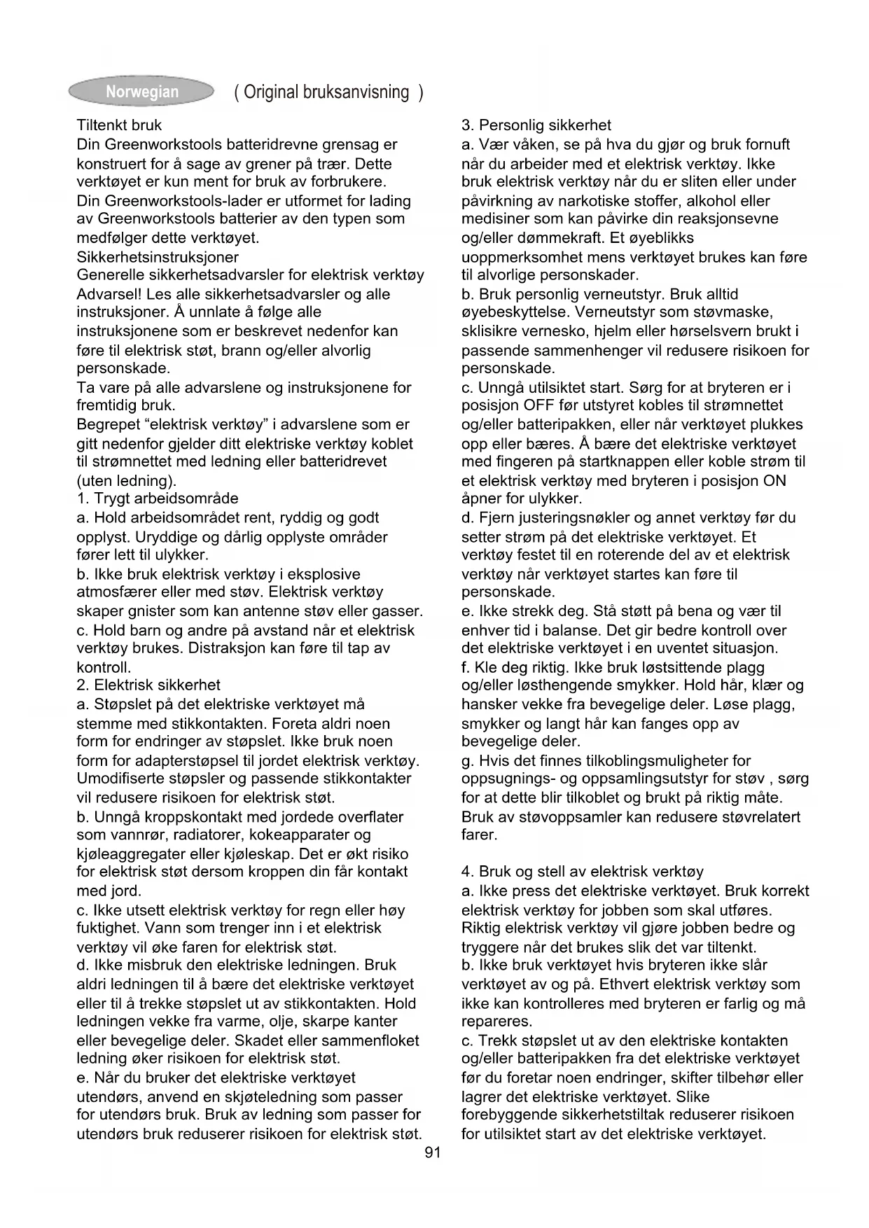 90( Original bruksanvisning ) Norwegian Tiltenkt bruk Din Greenworkstools batteridrevne grensag er konstruert for å sage av grener på trær. Dette verktøyet er kun ment for bruk av forbrukere. Din Greenworkstools-lader er utformet for lading av Greenworkstools batterier av den typen som medfølger dette verktøyet. Sikkerhetsinstruksjoner Generelle sikkerhetsadvarsler for elektrisk verktøy Advarsel! Les alle sikkerhetsadvarsler og alle instruksjoner. Å unnlate å følge alle instruksjonene som er beskrevet nedenfor kan føre til elektrisk støt, brann og/eller alvorlig personskade. Ta vare på alle advarslene og instruksjonene for fremtidig bruk. Begrepet “elektrisk verktøy” i advarslene som er gitt nedenfor gjelder ditt elektriske verktøy koblet til strømnettet med ledning eller batteridrevet (uten ledning).