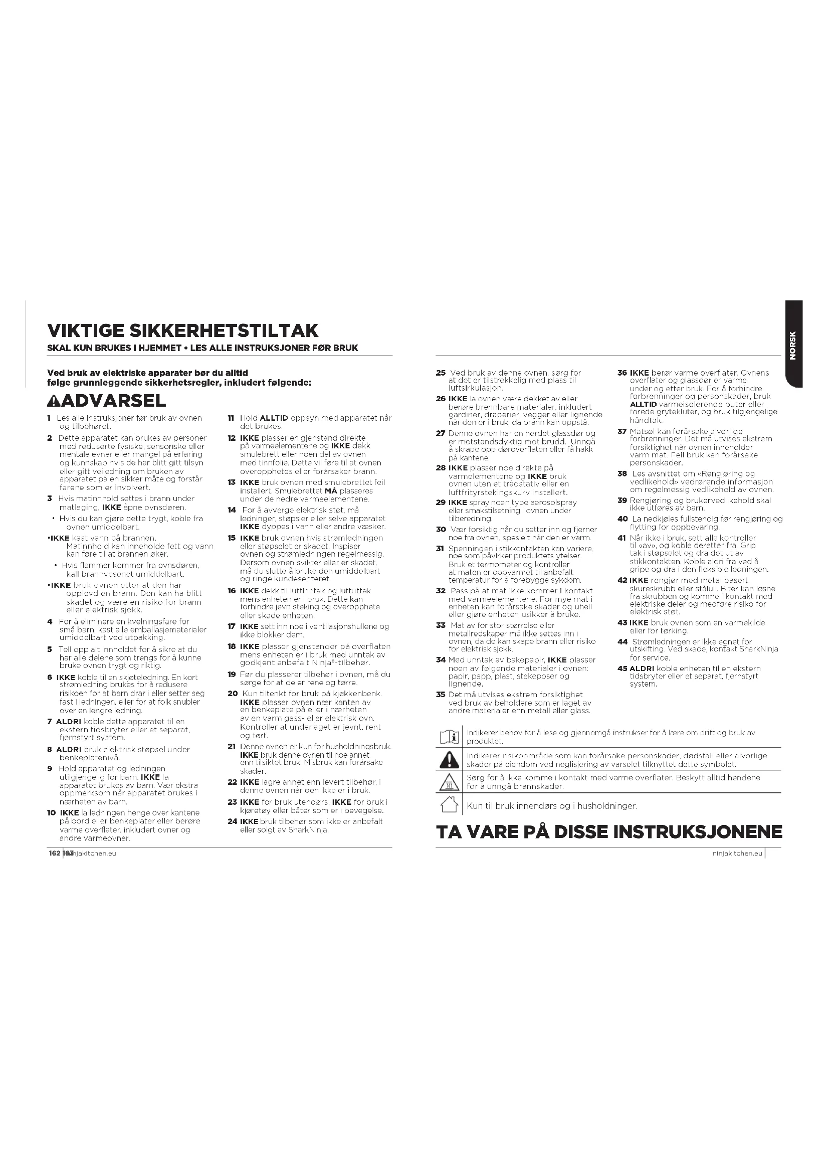 - IKKE bruk ovnen etter at den har opplevd en brann. Den kan ha blitt skadet og være en risiko for brann eller elektrisk sjokk. 4 For å eliminere en kvelningsfare for små barn, kast alle emballasjematerialer umiddelbart ved utpakking. 5 Tell opp alt innholdet for å sikre at du har alle delene som trengs for å kunne bruke ovnen trygt og riktig. 6 IKKE koble til en skjøteledning. En kort strømledning brukes for å redusere risikoen for at barn drar i eller setter seg fast i ledningen, eller for at folk snubler over en lengre ledning. 7 ALDRI koble dette apparatet til en ekstern tidsbryter eller et separat, fjernstyrt system. 8 ALDRI bruk elektrisk støpsel under benkeplatenivå. 9 Hold apparatet og ledningen utilgjengelig for barn. IKKE la apparatet brukes av barn. Vær ekstra oppmerksom når apparatet brukes i nærheten av barn. 10 IKKE la ledningen henge over kantene på bord eller benkeplater eller berøre varme overflater, inkludert ovner og andre varmeovner. 11 Hold ALLTID oppsyn med apparatet når det brukes. 12 IKKE plasser en gjenstand direkte på varmeelementene og IKKE dekk smulebrett eller noen del av ovnen med tinnfolie. Dette vil føre til at ovnen overopphetes eller forårsaker brann. 13 IKKE bruk ovnen med smulebrettet feil installert. Smulebrettet MÅ plasseres under de nedre varmeelementene. 14 For å avverge elektrisk støt, må ledninger, støpsler eller selve apparatet IKKE dyppes i vann eller andre væsker. 15 IKKE bruk ovnen hvis strømledningen eller støpselet er skadet. Inspiser ovnen og strømledningen regelmessig. Dersom ovnen svikter eller er skadet, må du slutte å bruke den umiddelbart og ringe kundesenteret. 16 IKKE dekk til luftinntak og luftuttak mens enheten er i bruk. Dette kan forhindre jevn steking og overopphete eller skade enheten. 17 IKKE sett inn noe i ventilasjonshullene og ikke blokker dem. 18 IKKE plasser gjenstander på overflaten mens enheten er i bruk med unntak av godkjent anbefalt Ninja®-tilbehør. 19 Før du plasserer tilbehør i ovnen, må du sørge for at de er rene og tørre. 20 Kun tiltenkt for bruk på kjøkkenbenk. IKKE plasser ovnen nær kanten av en benkeplate på eller i nærheten av en varm gass- eller elektrisk ovn. Kontroller at underlaget er jevnt, rent og tørt. 21 Denne ovnen er kun for husholdningsbruk. IKKE bruk denne ovnen til noe annet enn tilsiktet bruk. Misbruk kan forårsake skader. 22 IKKE lagre annet enn levert tilbehør, i denne ovnen når den ikke er i bruk. 23 IKKE for bruk utendørs. IKKE for bruk i kjøretøy eller båter som er i bevegelse. 24 IKKE bruk tilbehør som ikke er anbefalt eller solgt av SharkNinja. 25 Ved bruk av denne ovnen, sørg for at det er tilstrekkelig med plass til luftsirkulasjon. 26 IKKE la ovnen være dekket av eller berøre brennbare materialer, inkludert gardiner, draperier, vegger eller lignende når den er i bruk, da brann kan oppstå. 27 Denne ovnen har en herdet glassdør og er motstandsdyktig mot brudd. Unngå å skrape opp døroverflaten eller få hakk på kantene. 28 IKKE plasser noe direkte på varmelementene og IKKE bruk ovnen uten et trådstativ eller en luftfrityrstekingskurv installert. 29 IKKE spray noen type aerosolspray eller smakstilsetning i ovnen under tilberedning. 30 Vær forsiktig når du setter inn og fjerner noe fra ovnen, spesielt når den er varm. 31 Spenningen i stikkontakten kan variere, noe som påvirker produktets ytelser. Bruk et termometer og kontroller at maten er oppvarmet til anbefalt temperatur for å forebygge sykdom. 32 Pass på at mat ikke kommer i kontakt med varmeelementene. For mye mat i enheten kan forårsake skader og uhell eller gjøre enheten usikker å bruke. 33 Mat av for stor størrelse eller metallredskaper må ikke settes inn i ovnen, da de kan skape brann eller risiko for elektrisk sjokk. 34 Med unntak av bakepapir, IKKE plasser noen av følgende materialer i ovnen: papir, papp, plast, stekeposer og lignende. 35 Det må utvises ekstrem forsiktighet ved bruk av beholdere som er laget av andre materialer enn metall eller glass. 36 IKKE berør varme overflater. Ovnens overflater og glassdør er varme under og etter bruk. For å forhindre forbrenninger og personskader, bruk ALLTID varmeisolerende puter eller forede grytekluter, og bruk tilgjengelige håndtak. 37 Matsøl kan forårsake alvorlige forbrenninger. Det må utvises ekstrem forsiktighet når ovnen inneholder varm mat. Feil bruk kan forårsake personskader. 38 Les avsnittet om «Rengjøring og vedlikehold» vedrørende informasjon om regelmessig vedlikehold av ovnen. 39 Rengjøring og brukervedlikehold skal ikke utføres av barn. 40 La nedkjøles fullstendig før rengjøring og flytting for oppbevaring. 41 Når ikke i bruk, sett alle kontroller til «av», og koble deretter fra. Grip tak i støpselet og dra det ut av stikkontakten. Koble aldri fra ved å gripe og dra i den fleksible ledningen. 42 IKKE rengjør med metallbasert skureskrubb eller stålull. Biter kan løsne fra skrubben og komme i kontakt med elektriske deler og medføre risiko for elektrisk støt. 43 IKKE bruk ovnen som en varmekilde eller for tørking. 44 Strømledningen er ikke egnet for utskifting. Ved skade, kontakt SharkNinja for service. 45 ALDRI koble enheten til en ekstern tidsbryter eller et separat, fjernstyrt system.