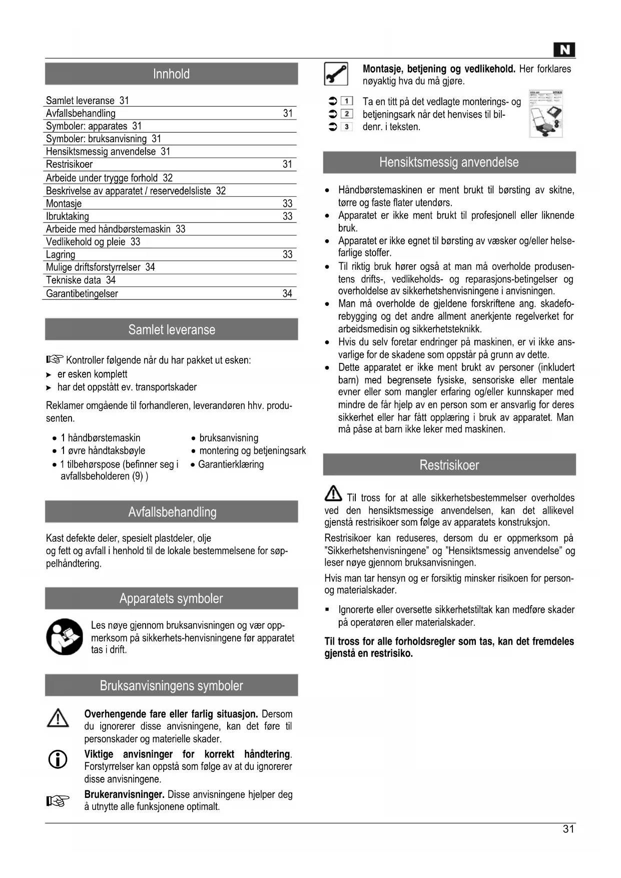 Garanzia Si prega di fare riferimento alla dichiarazione di garanzia allegata.31 Innhold Samlet leveranse 31 Avfallsbehandling 31 Symboler: apparates 31 Symboler: bruksanvisning 31 Hensiktsmessig anvendelse 31 Restrisikoer 31 Arbeide under trygge forhold 32 Beskrivelse av apparatet / reservedelsliste 32 Montasje 33 Ibruktaking 33 Arbeide med håndbørstemaskin 33 Vedlikehold og pleie 33 Lagring 33 Mulige driftsforstyrrelser 34 Tekniske data 34 Garantibetingelser 34