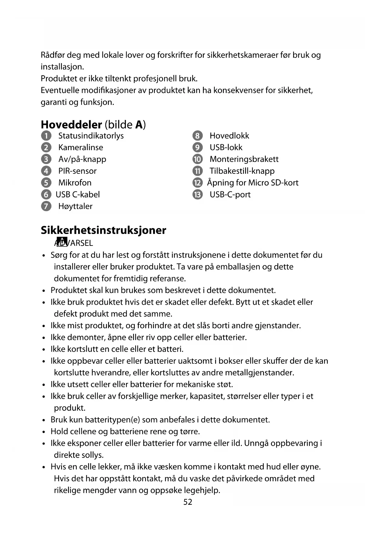 Hurtigguide Wi-Fi-batterikamera WIFICBO30WT For mer informasjon, se den fullstendige bruksanvisningen på nett: ned.is/wicbo30wt Tiltenkt bruk Produktet er tiltenkt brukt som IP-sikkerhetskamera til innendørs og utendørs bruk.52 Rådfør deg med lokale lover og forskrifter for sikkerhetskameraer før bruk og installasjon. Produktet er ikke tiltenkt profesjonell bruk. Eventuelle modikasjoner av produktet kan ha konsekvenser for sikkerhet, garanti og funksjon. Hoveddeler (bilde A) 1 Statusindikatorlys 2 Kameralinse 3 Av/på-knapp 4 PIR-sensor 5 Mikrofon 6 USB C-kabel 7 Høyttaler 8 Hovedlokk 9 USB-lokk q Monteringsbrakett w Tilbakestill-knapp e Åpning for Micro SD-kort r USB-C-port Sikkerhetsinstruksjoner