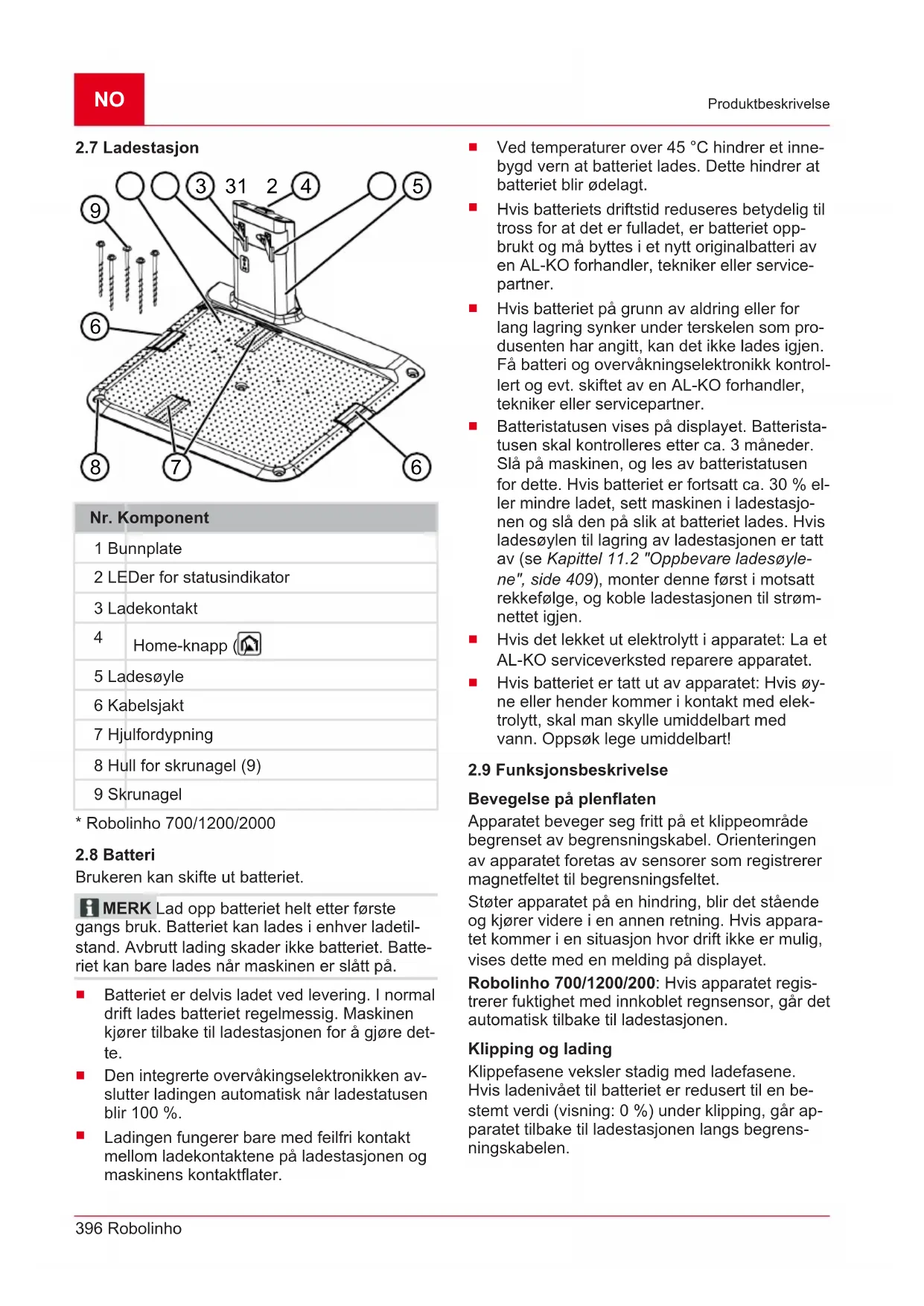 Batteriet er delvis ladet ved levering. I normal drift lades batteriet regelmessig. Maskinen kjører tilbake til ladestasjonen for å gjøre det- te.