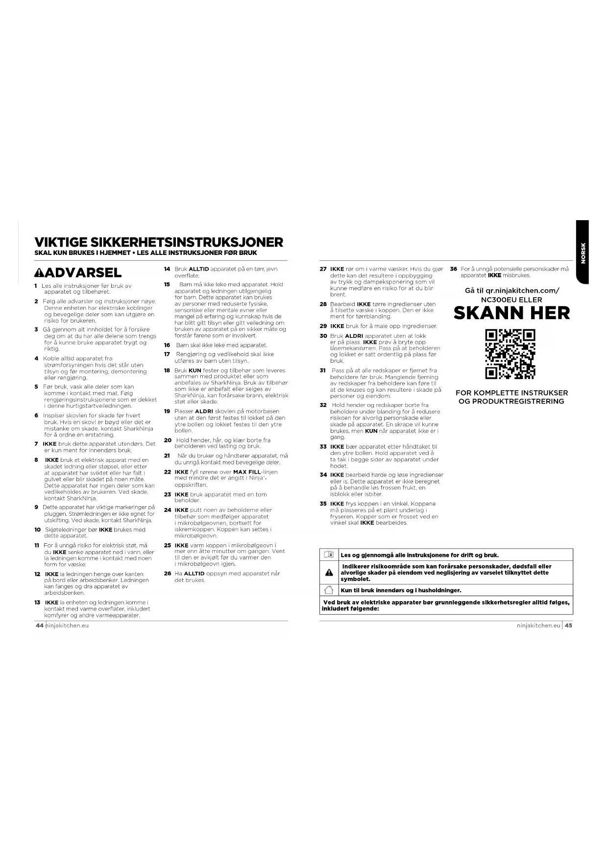 OG PRODUKTREGISTRERING Les og gjennomgå alle instruksjonene for drift og bruk. Indikerer risikoområde som kan forårsake personskader, dødsfall eller alvorlige skader på eiendom ved neglisjering av varselet tilknyttet dette symbolet.Kun til bruk innendørs og i husholdninger. Ved bruk av elektriske apparater bør grunnleggende sikkerhetsregler alltid følges, inkludert følgende:NORSK 46 ninjakitchen.eu ninjakitchen.eu