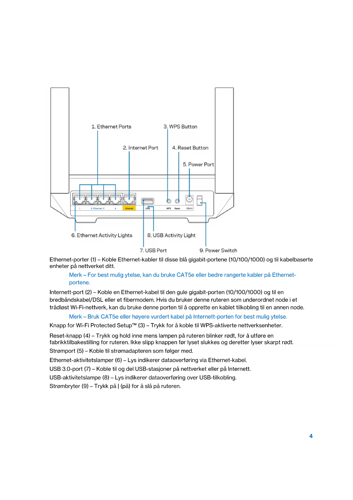 Ethernet-porter (1) – Koble Ethernet-kabler til disse blå gigabit-portene (10/100/1000) og til kabelbaserte enheter på nettverket ditt. Merk – For best mulig ytelse, kan du bruke CAT5e eller bedre rangerte kabler på Ethernet- portene. Internett-port (2) – Koble en Ethernet-kabel til den gule gigabit-porten (10/100/1000) og til en bredbåndskabel/DSL eller et fibermodem. Hvis du bruker denne ruteren som underordnet node i et trådløst Wi-Fi-nettverk, kan du bruke denne porten til å opprette en kablet tilkobling til en annen node. Merk – Bruk CAT5e eller høyere vurdert kabel på Internett-porten for best mulig ytelse. Knapp for Wi-Fi Protected Setup™ (3) – Trykk for å koble til WPS-aktiverte nettverksenheter. Reset-knapp (4) – Trykk og hold inne mens lampen på ruteren blinker rødt, for å utføre en fabrikktilbakestilling for ruteren. Ikke slipp knappen før lyset slukkes og deretter lyser skarpt rødt. Strømport (5) – Koble til strømadapteren som følger med. Ethernet-aktivitetslamper (6) – Lys indikerer dataoverføring via Ethernet-kabel. USB 3.0-port (7) – Koble til og del USB-stasjoner på nettverket eller på Internett. USB-aktivitetslampe (8) – Lys indikerer dataoverføring over USB-tilkobling. Strømbryter (9) – Trykk på | (på) for å slå på ruteren.5 Hjelp Her finner du mer hjelp