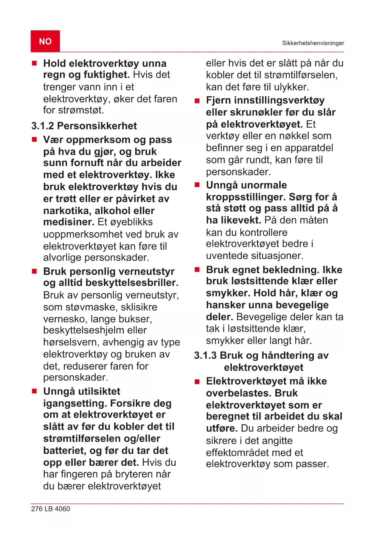 Unngå kroppskontakt med jordete overflater som f.eks. fra rør, varmeovner, komfyrer eller kjøleskap. Det er økt fare for strømstøt når kroppen din er jordet.NO 276 LB 4060 Sikkerhetshenvisninger