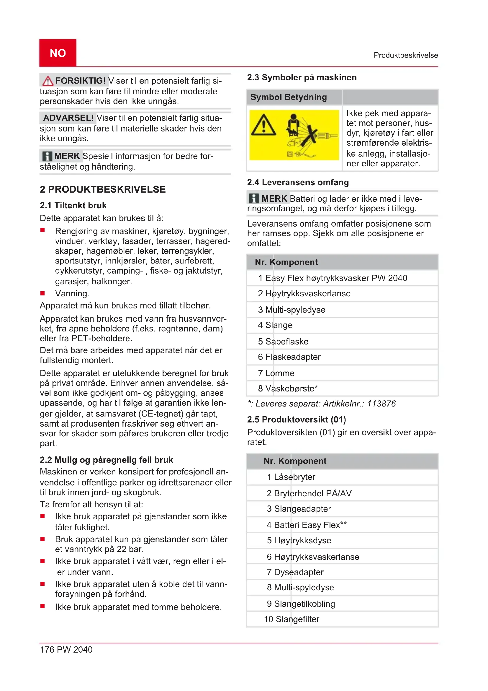 FARE! Viser til en umiddelbart farlig situa- sjon som fører til død eller alvorlige personskader hvis den ikke unngås. ADVARSEL! Viser til en potensielt farlig si- tuasjon som kan føre til død eller alvorlige per- sonskader hvis den ikke unngås.NO 176 PW 2040 Produktbeskrivelse FORSIKTIG! Viser til en potensielt farlig si- tuasjon som kan føre til mindre eller moderate personskader hvis den ikke unngås. ADVARSEL! Viser til en potensielt farlig situa- sjon som kan føre til materielle skader hvis den ikke unngås. MERK Spesiell informasjon for bedre for- ståelighet og håndtering. 2 PRODUKTBESKRIVELSE