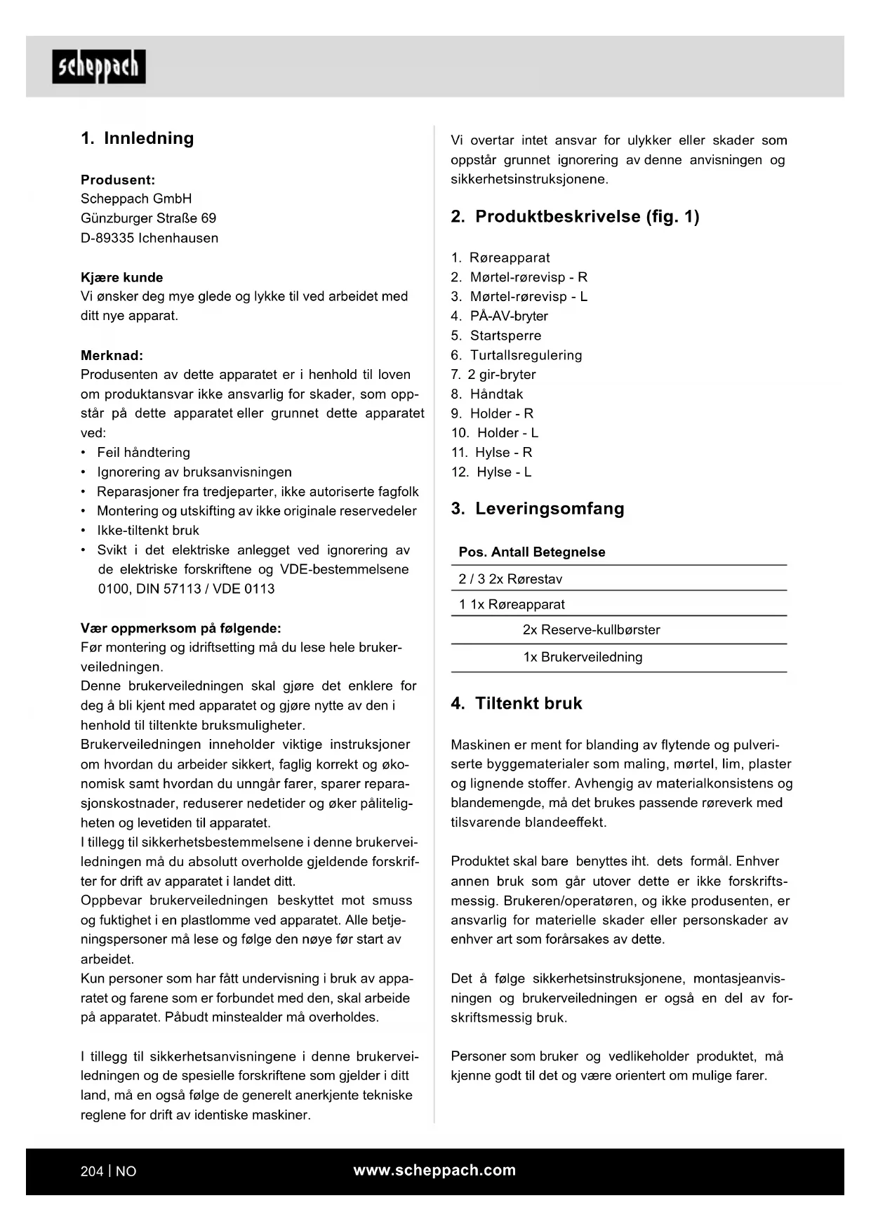 - Svikt i det elektriske anlegget ved ignorering av de elektriske forskriftene og VDE-bestemmelsene 0100, DIN 57113 / VDE 0113 Vær oppmerksom på følgende: Før montering og idriftsetting må du lese hele bruker- veiledningen. Denne brukerveiledningen skal gjøre det enklere for deg å bli kjent med apparatet og gjøre nytte av den i henhold til tiltenkte bruksmuligheter. Brukerveiledningen inneholder viktige instruksjoner om hvordan du arbeider sikkert, faglig korrekt og øko- nomisk samt hvordan du unngår farer, sparer repara- sjonskostnader, reduserer nedetider og øker pålitelig- heten og levetiden til apparatet. I tillegg til sikkerhetsbestemmelsene i denne brukervei- ledningen må du absolutt overholde gjeldende forskrif- ter for drift av apparatet i landet ditt. Oppbevar brukerveiledningen beskyttet mot smuss og fuktighet i en plastlomme ved apparatet. Alle betje- ningspersoner må lese og følge den nøye før start av arbeidet. Kun personer som har fått undervisning i bruk av appa- ratet og farene som er forbundet med den, skal arbeide på apparatet. Påbudt minstealder må overholdes. I tillegg til sikkerhetsanvisningene i denne brukervei- ledningen og de spesielle forskriftene som gjelder i ditt land, må en også følge de generelt anerkjente tekniske reglene for drift av identiske maskiner.www.scheppach.com