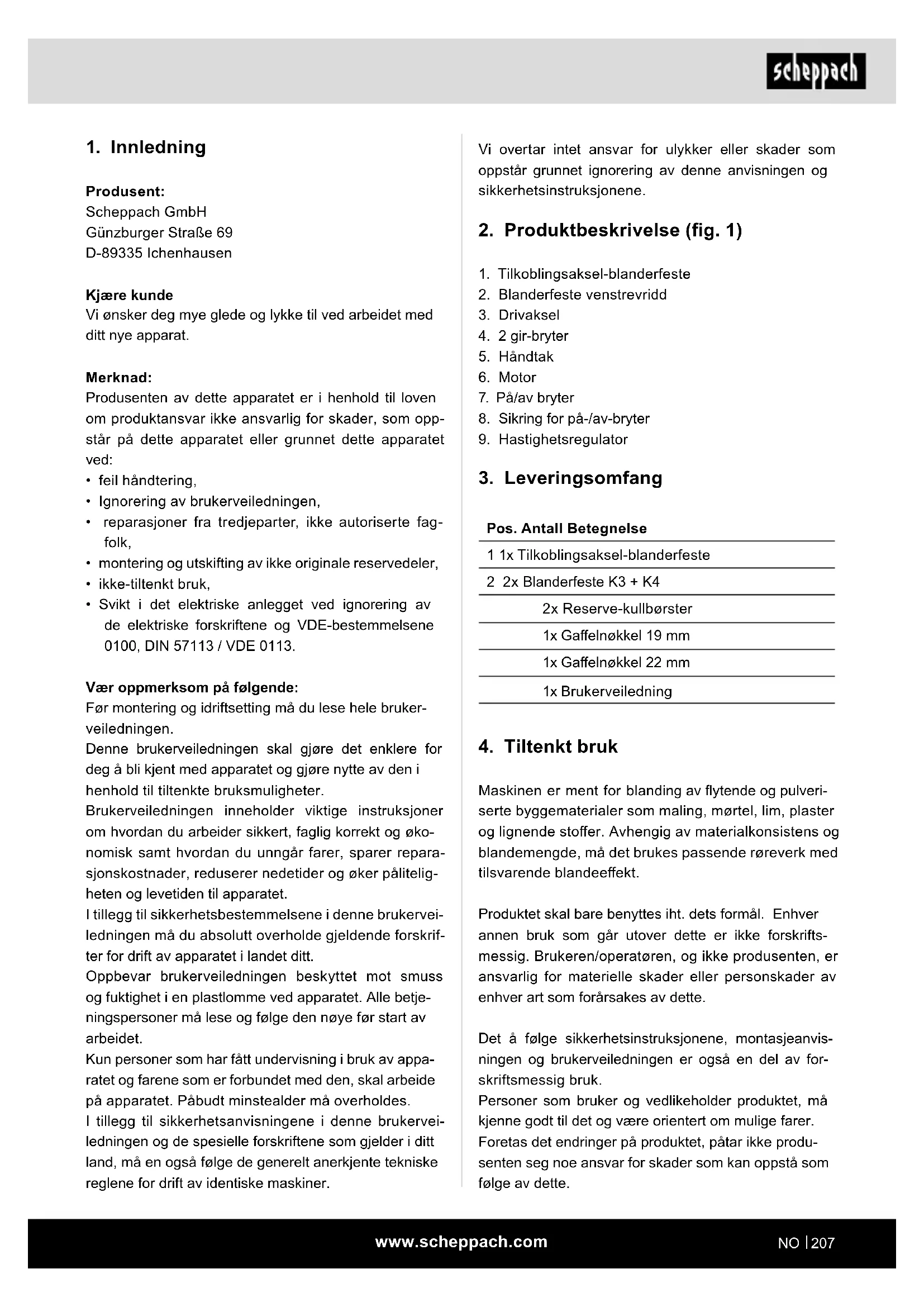 - Svikt i det elektriske anlegget ved ignorering av de elektriske forskriftene og VDE-bestemmelsene 0100, DIN 57113 / VDE 0113. Vær oppmerksom på følgende: Før montering og idriftsetting må du lese hele bruker- veiledningen. Denne brukerveiledningen skal gjøre det enklere for deg å bli kjent med apparatet og gjøre nytte av den i henhold til tiltenkte bruksmuligheter. Brukerveiledningen inneholder viktige instruksjoner om hvordan du arbeider sikkert, faglig korrekt og øko- nomisk samt hvordan du unngår farer, sparer repara- sjonskostnader, reduserer nedetider og øker pålitelig- heten og levetiden til apparatet. I tillegg til sikkerhetsbestemmelsene i denne brukervei- ledningen må du absolutt overholde gjeldende forskrif- ter for drift av apparatet i landet ditt. Oppbevar brukerveiledningen beskyttet mot smuss og fuktighet i en plastlomme ved apparatet. Alle betje- ningspersoner må lese og følge den nøye før start av arbeidet. Kun personer som har fått undervisning i bruk av appa- ratet og farene som er forbundet med den, skal arbeide på apparatet. Påbudt minstealder må overholdes. I tillegg til sikkerhetsanvisningene i denne brukervei- ledningen og de spesielle forskriftene som gjelder i ditt land, må en også følge de generelt anerkjente tekniske reglene for drift av identiske maskiner.www.scheppach.com