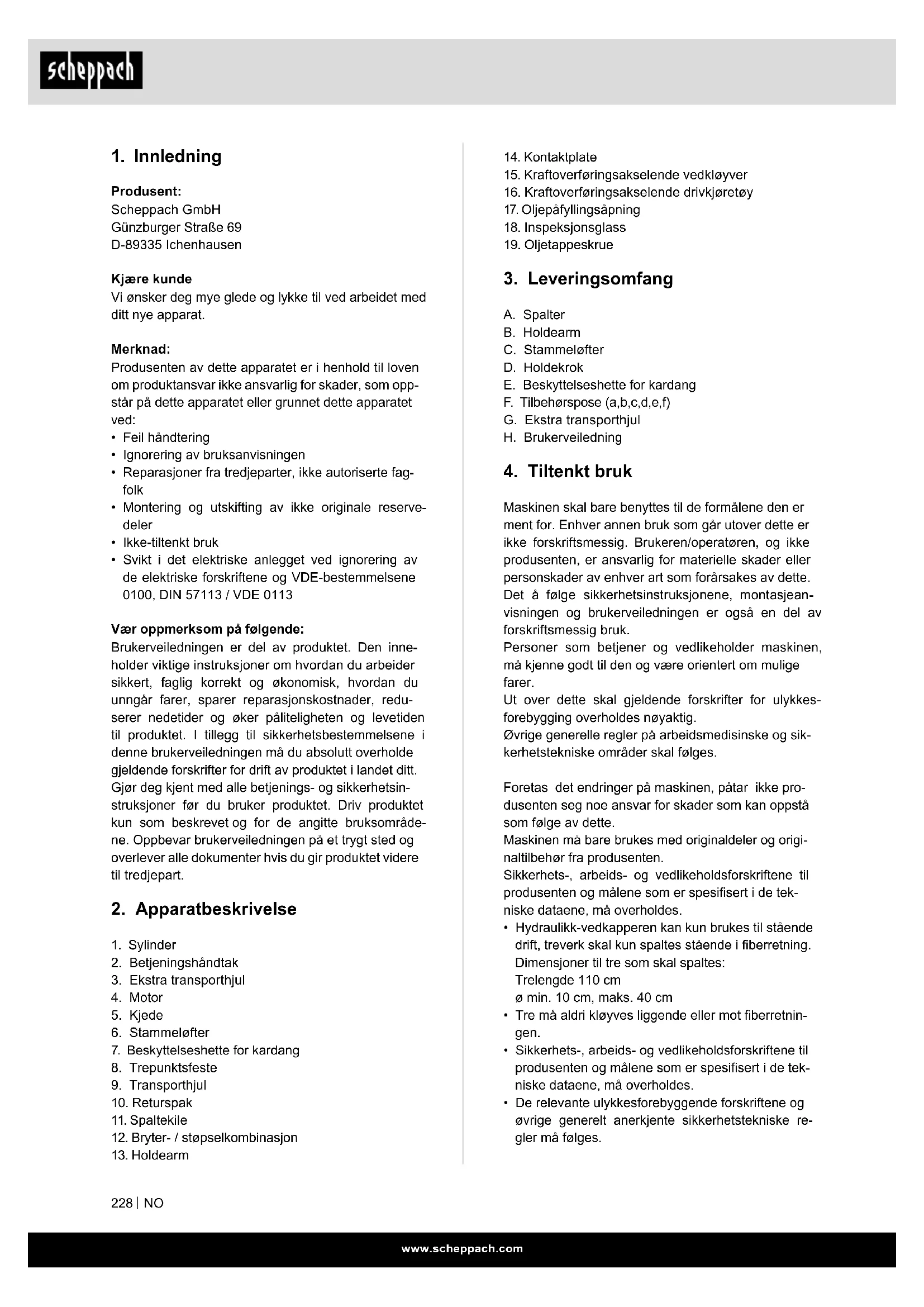 Forklaring av symbolene på apparatet Bruken av symboler i denne håndboken er ment å gjøre deg oppmerksom på potensielle risikoer. Sikkerhetssymbolene og forklaringene som følger med dem må bli forstått. Advarslene i seg selv eliminerer ingen risikoer og kan ikke erstatte riktige ulykkesforebyggende tiltak. Les håndboken før idriftsetting Bruk ulykkessikre sko Bruk arbeidshansker Bruk hørselsvern og vernebrille Bruke sikkerhetshjelm Røyking forbudt i arbeidsområdet Ikke la hydraulikkolje renne på gulvet Du skal holde arbeidsområdet ryddig! Uorden kan føre til ulykker! Du må kassere den gamle oljen forskriftsmessig (lokalt innsamlingssted for gammel olje). Det er forbudt å helle gammel olje i bakken eller blande det med avfall. Ikke fjern fastkilte stammer med hendene. Det er forbudt å fjerne eller endre beskyttelse- og sikkerhetsanordninger. Obs! Før reparasjons-, vedlikeholds- og rengjøringsarbeider slå av motoren og trekke ut strømpluggen.www.scheppach.com