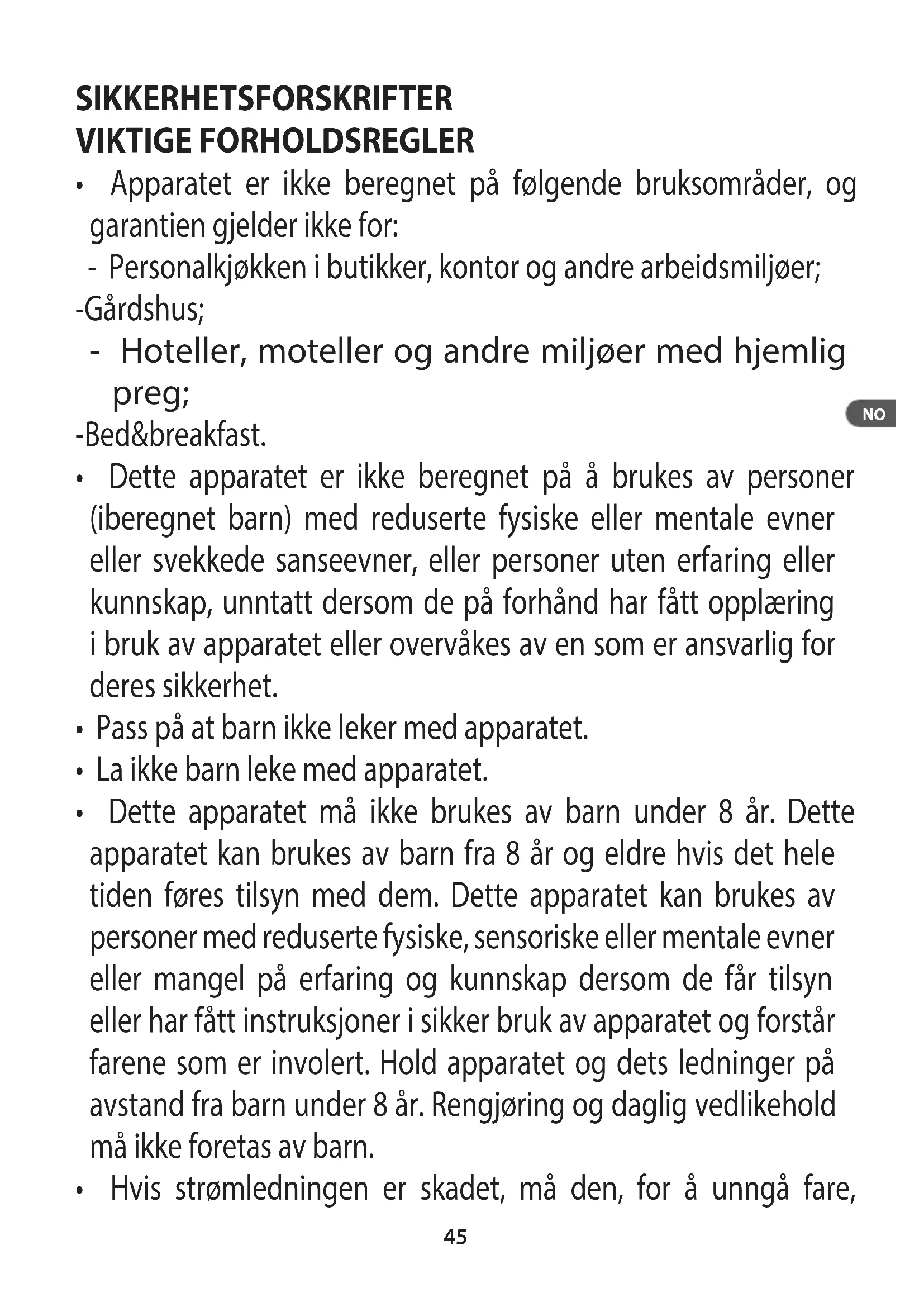 - Dette apparatet er/DDke beregnet paa brakes av personer (iberegnet barn) med reduserte fysiske ellr mentale evner eller svekkede sanseevner, ellr personer uten erfaring eller kunnskap, unntatt dersom de pa forhand har fatt opplaering i bruk av apparatet eller overvakes av en som er ansvarlig for deres sikkerhet.