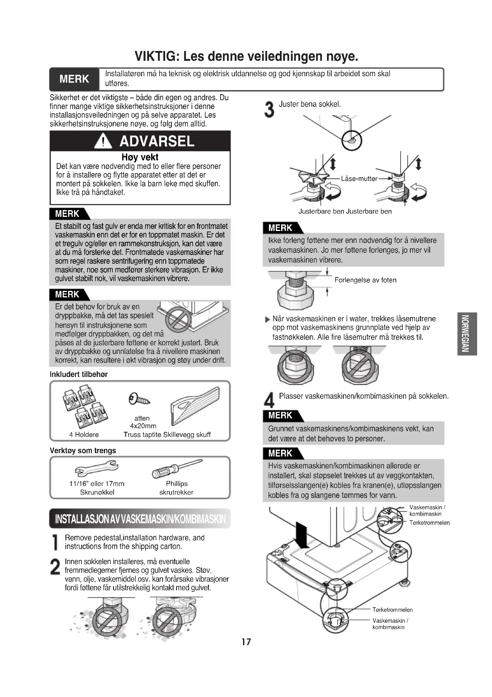 Påse at hullene i sokkelen flukter overens med hullene i apparatet. Installer deretter de 4 skruene i hvert sitt hjørne for å fastgjøre apparatet til sokkelen på en forsvarlig måte. Juster bena på maskinen hvis gulvet er skjevt. Låse-mutter Justerbare ben Justerbare ben Flytt vaskemaskinen/kombimaskinen dit den skal stå. Diagonal kontroll Når du presser ned hjørnene på maskinen ved å trykke diagonalt på topplaten, skal maskinen overhodet ikke bevege seg opp eller ned (Kontroller begge retningene). Dersom maskinen beveger seg når du presser diagonalt på topplaten, må du justere føttene på nytt. MERK For å sikre at vaskemaskinen er i water, kan du testkjøre den: legg i ca. 3 kg vasketøy i maskinen. Trykk deretter på PÅ/AV-knappen, RINSE+SPIN og deretter START/PAUSE-knappen. Se etterfølgende avsnitt for ytterligere informasjon om valg av sentrifugering og betjening. Kontroller at vaskemaskinen ikke vugger eller vibrerer overdrevent under sentrifugeringen. Vibrerer eller rister vaskemaskinen, må du justere de justerbare føttene inntil vaskemaskinen står støtt. Testkjør deretter maskinen på nytt. MERK Hvis skruene ikke er korrekt installert, kan det medføre støy og vibrasjoner. Til VASKEMASKIN: 16 SKRUER Til TØRKEMASKIN: 8 SKRUER MERK Apparatet må plasseres på et solid gulv og i vater for å fungere riktig. Juster bena på apparatet og sokkelen ved hjelp av en skiftenøkkel. Skru deretter låseskruen mot sokkelen mens du holder benet på sokkelen i stilling ved hjelp av en skiftenøkkel. Installatøren må ha elektrisk og mekanisk utdannelse og god kjennskap til arbeidet som skal utføres. MERK Låse-mutter Justerbare ben Justerbare ben NORWEGIAN19 Ettersom tørketrommelen er tung, kan det være nødvendig med to personer for å løfte den. MERK Pakk ut sokkelen, monteringsrekvisita og installasjonsinstruksjonene. Påse at hullene i sokkelen flukter overens med hullene i apparatet. Installer deretter de 2 skruene i hvert sitt hjørne for å fastgjøre apparatet til sokkelen på en forsvarlig måte. INSTALLASJON AV TØRKETROMMELEN Position dryer on top of the pedestal. Anbring T-klipset for de 4 holderne i tørketrommelens grunnplate, slik som vist. Press opp klipset bak og trekk det utover for å låse det på plass. Vaskemaskin / kombimaskin Tørketrommelen Tørketrommelen Vaskemaskin / kombimaskin Hvis tørketrommelen allerede er installert, skal den kobles fra som følger: MERK A. Koble fra en elektrisk tørketrommel: