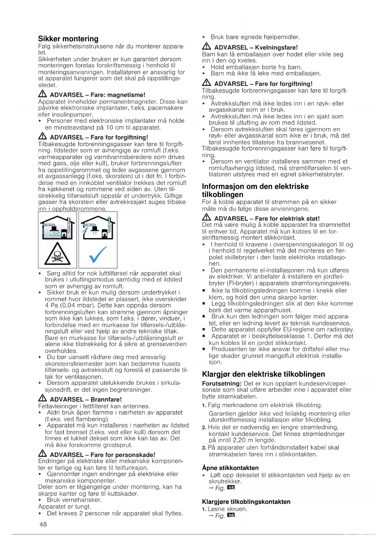 Generell informasjon ¡ Les nøye gjennom denne anvisningen. ¡ Apparatet skal kun installeres av autori- serte fagfolk. ¡ Slå alltid av strømtilførselen før det skal gjennomføres arbeider. ¡ Dette apparatet må aldri brukes i båter el- ler kjøretøy. ¡ Følg anbefalingene fra produsenten av benkeplaten.48 Sikker montering Følg sikkerhetsinstruksene når du monterer appara- tet. Sikkerheten under bruken er kun garantert dersom monteringen foretas forskriftsmessig i henhold til monteringsanvisningen. Installatøren er ansvarlig for at apparatet fungerer som det skal på oppstillings- stedet. ADVARSEL‒Fare: magnetisme! Apparatet inneholder permanentmagneter. Disse kan påvirke elektroniske implantater, f.eks. pacemakere eller insulinpumper. ▶ Personer med elektroniske implantater må holde en minsteavstand på 10cm til apparatet. ADVARSEL‒Fare for forgiftning! Tilbakesugde forbrenningsgasser kan føre til forgift- ning. Ildsteder som er avhengige av romluft (f.eks. varmeapparater og varmtvannsberedere som drives med gass, olje eller kull), bruker forbrenningsluften fra oppstillingsrommet og leder avgassene gjennom et avgassanlegg (f.eks. skorstein) ut i det fri. I forbin- delse med en innkoblet ventilator trekkes det romluft fra kjøkkenet og rommene ved siden av. Uten til- strekkelig tilførselsluft oppstår et undertrykk. Giftige gasser fra skorstein eller avtrekkssjakt suges tilbake inn i oppholdsrommene. ▶ Sørg alltid for nok lufttilførsel når apparatet skal brukes i utluftingsmodus samtidig med et ildsted som er avhengig av romluft. ▶ Sikker bruk er kun mulig dersom undertrykket i rommet hvor ildstedet er plassert, ikke overskrider 4Pa (0,04mbar). Dette kan oppnås dersom forbrenningsluften kan strømme gjennom åpninger som ikke kan lukkes, som f.eks. i dører, vinduer, i forbindelse med en murkasse for tilførsels-/utblås- ningsluft eller ved hjelp av andre tekniske tiltak. Bare en murkasse for tilførsels-/utblåsningsluft er alene ikke tilstrekkelig for å sikre at grenseverdien overholdes. ▶ Du bør uansett rådføre deg med ansvarlig skorsteinsfeiemester som kan bedømme husets tilførsels- og avtrekksluft og foreslå et passende til- tak for ventilasjonen. ▶ Dersom apparatet utelukkende brukes i sirkula- sjonsdrift, er det ingen begrensninger. ADVARSEL‒Brannfare! Fettavleiringer i fettfilteret kan antennes. ▶ Aldri bruk åpen flamme i nærheten av apparatet (f.eks. ved flambering). ▶ Apparatet må kun installeres i nærheten av ildsted for fast brensel (f.eks. ved eller kull) dersom det finnes et lukket deksel som ikke kan tas av. Det må ikke forekomme gnistsprut. ADVARSEL‒Fare for personskade! Endringer på elektriske eller mekaniske komponen- ter er farlige og kan føre til feilfunksjon. ▶ Gjennomfør ingen endringer på elektriske eller mekaniske komponenter. Deler som er tilgjengelige under montering, kan ha skarpe kanter og føre til kuttskader. ▶ Bruk vernehansker. Apparatet er tungt. ▶ Det kreves 2 personer når apparatet skal flyttes. ▶ Bruk bare egnede hjelpemidler. ADVARSEL‒Kvelningsfare! Barn kan få emballasjen over hodet eller vikle seg inn i den og kveles. ▶ Hold emballasjen borte fra barn. ▶ Barn må ikke få leke med emballasjen. ADVARSEL‒Fare for forgiftning! Tilbakesugde forbrenningsgasser kan føre til forgift- ning. ▶ Avtrekksluften må ikke ledes inn i en røyk- eller avgasskanal som er i bruk. ▶ Avtrekksluften må ikke ledes inn i en sjakt som brukes til utlufting av rom med ildsted. ▶ Dersom avtrekksluften skal føres igjennom en røyk- eller avgasskanal som ikke er i bruk, må det først innhentes tillatelse fra brannvesenet. Tilbakesugde forbrenningsgasser kan føre til forgift- ning. ▶ Dersom en ventilator installeres sammen med et romluftavhengig ildsted, må strømtilførselen til ven- tilatoren utstyres med en egnet sikkerhetsbryter. Informasjon om den elektriske tilkoblingen For å koble apparatet til strømmen på en sikker måte må du følge disse anvisningene. ADVARSEL‒Fare for elektrisk støt! Det må være mulig å koble apparatet fra strømnettet til enhver tid. Apparatet må kun kobles til en for- skriftsmessig montert stikkontakt. ▶ I henhold til kravene i overspenningskategori III og i henhold til regelverket må det monteres en fler- polet skillebryter i den faste elektriske installasjo- nen. ▶ Den permanente el-installasjonen må kun utføres av elektriker. Vi anbefaler å installere en jordfeil- bryter (FI-bryter) i apparatets strømforsyningskrets. ¡ Ikke la tilkoblingsledningen komme i knekk eller klem, og hold den unna skarpe kanter. ¡ Legg tilkoblingsledningen slik at den ikke kommer borti det varme apparathuset. ¡ Bruk kun den ledningen som følger med appara- tet, eller en ledning levert av teknisk kundeservice. ¡ Dette apparatet oppfyller EU-reglene om radiostøy. ¡ Apparatet er i beskyttelsesklasse 1. Derfor må det kun kobles til en jordet stikkontakt. ¡ Produsenten tar ikke ansvar for driftsfeil eller mu- lige skader grunnet mangelfull elektrisk installa- sjon. Klargjør den elektriske tilkoblingen Forutsetning:Det er kun opplært kundeserviceper- sonale som skal utføre arbeider inne i apparatet eller bytte strømkabelen.