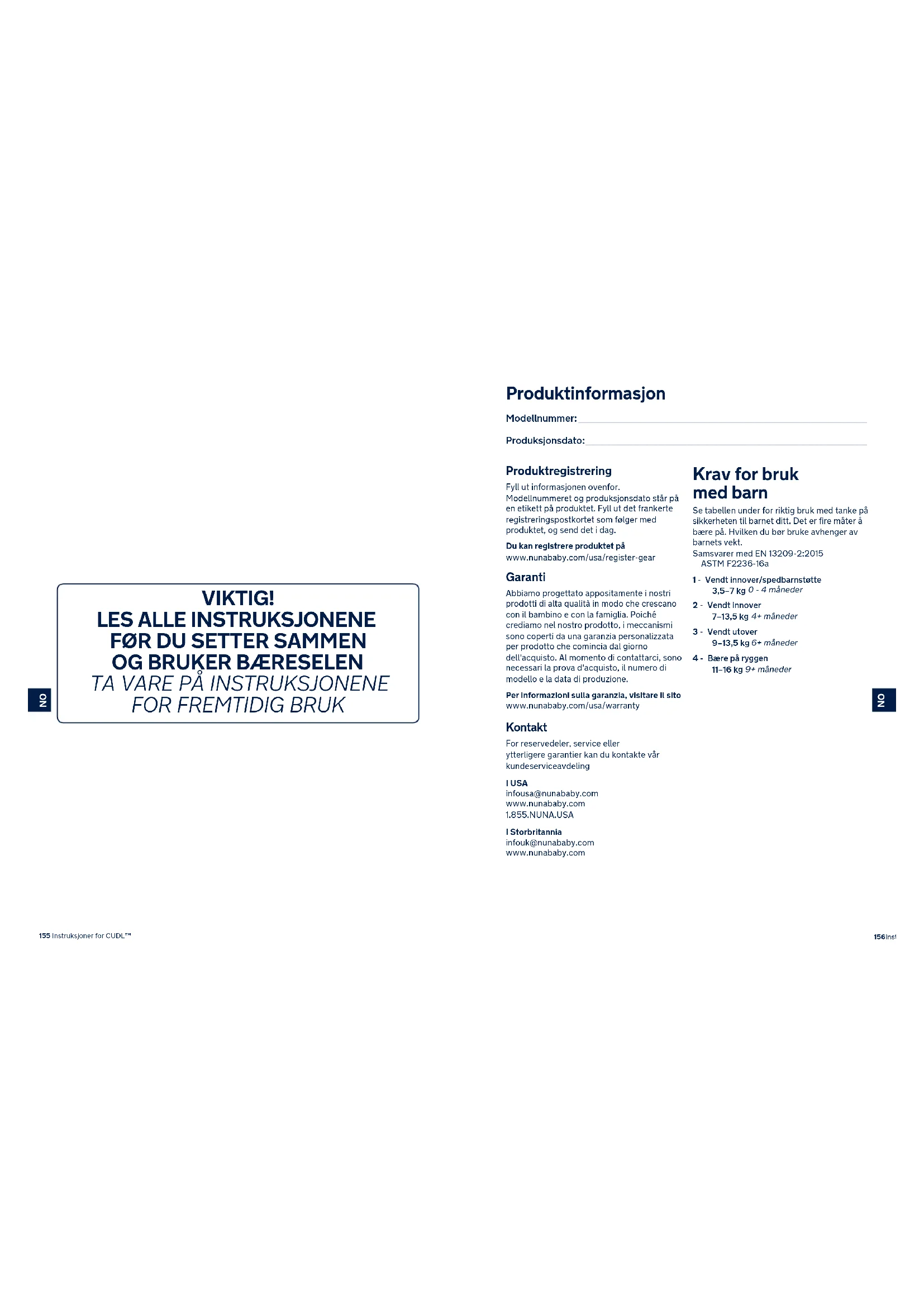 4+ måneder3 - Vendt utover 9–13,5 kg 6+ måneder4 - Bære på ryggen 11–16 kg 9+ måneder155 Instruksjoner for CUDL™ 156Instruksjoner for CUDL™ VIKTIG!