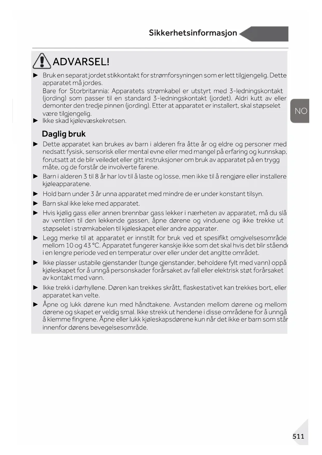 ADVARSEL! ► Bruk en separat jordet stikkontakt for strømforsyningen som er lett tilgjengelig. Dette apparatet må jordes. Bare for Storbritannia: Apparatets strømkabel er utstyrt med 3-ledningskontakt (jording) som passer til en standard 3-ledningskontakt (jordet). Aldri kutt av eller demonter den tredje pinnen (jording). Etter at apparatet er installert, skal støpselet være tilgjengelig. ► Ikke skad kjølevæskekretsen. Daglig bruk ► Dette apparatet kan brukes av barn i alderen fra åtte år og eldre og personer med nedsatt fysisk, sensorisk eller mental evne eller med mangel på erfaring og kunnskap, forutsatt at de blir veiledet eller gitt instruksjoner om bruk av apparatet på en trygg måte, og de forstår de involverte farene. ► Barn i alderen 3 til 8 år har lov til å laste og losse, men ikke til å rengjøre eller installere kjøleapparatene. ► Hold barn under 3 år unna apparatet med mindre de er under konstant tilsyn. ► Barn skal ikke leke med apparatet. ► Hvis kjølig gass eller annen brennbar gass lekker i nærheten av apparatet, må du slå av ventilen til den lekkende gassen, åpne dørene og vinduene og ikke trekke ut støpselet i strømkabelen til kjøleskapet eller andre apparater. ► Legg merke til at apparatet er innstilt for bruk ved et spesifikt omgivelsesområde mellom 10 og 43 °C. Apparatet fungerer kanskje ikke som det skal hvis det blir stående i en lengre periode ved en temperatur over eller under det angitte området. ► Ikke plasser ustabile gjenstander (tunge gjenstander, beholdere fylt med vann) oppå kjøleskapet for å unngå personskader forårsaket av fall eller elektrisk støt forårsaket av kontakt med vann. ► Ikke trekk i dørhyllene. Døren kan trekkes skrått, flaskestativet kan trekkes bort, eller apparatet kan velte. ► Åpne og lukk dørene kun med håndtakene. Avstanden mellom dørene og mellom dørene og skapet er veldig smal. Ikke strekk ut hendene i disse områdene for å unngå å klemme fingrene. Åpne eller lukk kjøleskapsdørene kun når det ikke er barn som står innenfor dørens bevegelsesområde.512 Sikkerhetsinformasjon