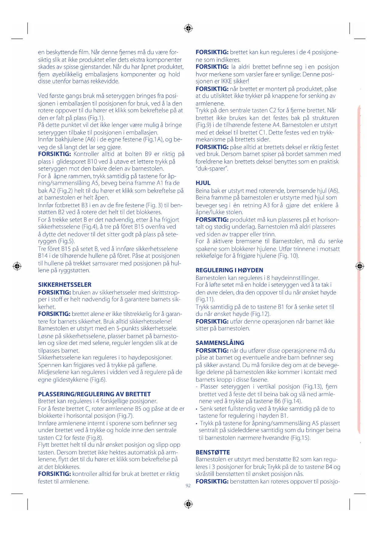en beskyttende lm. Når denne ernes må du være for- siktig slik at ikke produktet eller dets ekstra komponenter skades av spisse gjenstander. Når du har åpnet produktet, ern øyeblikkelig emballasjens komponenter og hold disse utenfor barnas rekkevidde. Ved første gangs bruk må seteryggen bringes fra posi- sjonen i emballasjen til posisjonen for bruk, ved å la den rotere oppover til du hører et klikk som bekreftelse på at den er falt på plass (Fig.1). På dette punktet vil det ikke lenger være mulig å bringe seteryggen tilbake til posisjonen i emballasjen. Innfør bakhjulene (A6) i de egne festene (Fig.1A), og be- veg de så langt det lar seg gjøre. FORSIKTIG: Kontroller alltid at bolten B9 er riktig på plass i glidesporet B10 ved å utøve et lettere trykk på seteryggen mot den bakre delen av barnestolen. For å åpne rammen, trykk samtidig på tastene for åp- ning/sammenslåing A5, beveg beina framme A1 fra de bak A2 (Fig.2) helt til du hører et klikk som bekreftelse på at barnestolen er helt åpen. Innfør fotbrettet B3 i en av de re festene (Fig. 3) til ben- støtten B2 ved å rotere det helt til det blokkeres. For å trekke setet B er det nødvendig, etter å ha frigjort sikkerhetsselene (Fig.4), å tre på fôret B15 ovenfra ved å dytte det nedover til det sitter godt på plass på sete- ryggen (Fig.5). Tre fôret B15 på setet B, ved å innføre sikkerhetsselene B14 i de tilhørende hullene på fôret. Påse at posisjonen til hullene på trekket samsvarer med posisjonen på hul- lene på ryggstøtten. SIKKERHETSSELER FORSIKTIG: bruken av sikkerhetsseler med skrittstrop- per i sto er helt nødvendig for å garantere barnets sik- kerhet. FORSIKTIG: brettet alene er ikke tilstrekkelig for å garan- tere for barnets sikkerhet. Bruk alltid sikkerhetsselene! Barnestolen er utstyrt med en 5-punkts sikkerhetssele. Løsne på sikkerhetsselene, plasser barnet på barnesto- len og sikre det med selene, reguler lengden slik at de tilpasses barnet. Sikkerhetsselene kan reguleres i to høydeposisjoner. Spennen kan frigjøres ved å trykke på gaene. Midjeselene kan reguleres i vidden ved å regulere på de egne glidestykkene (Fig.6).