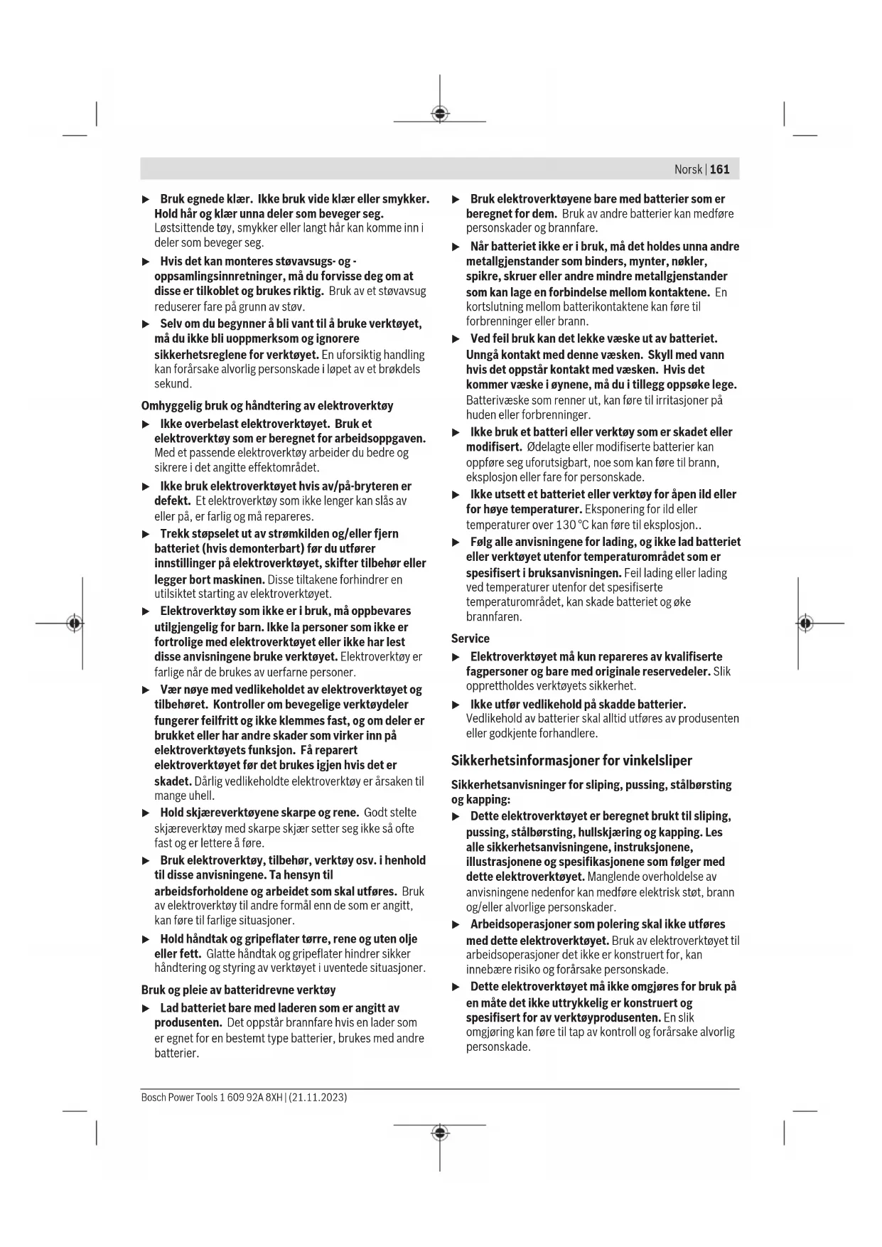 Bluetooth® Low Energy ModuleGCY42 ingår inte i standardleveransen Connectivity-funktioner (GWS18V-15 C / GWS18V-15 SC/ GWS18V-15 PSC) Med Bluetooth® Low Energy ModuleGCY42 (ingår inte i standardleveransomfattningen) finns följande Connectivity- funktioner tillgängliga för elverktyget: – Registrering och individuell anpassning – Statuskontroll, utgående varningsmeddelanden – Allmän information och inställningar – Administration För mer information om Bluetooth® Low Energy ModuleGCY42 (ingår inte i standardleveransomfattningen), läs tillhörande bruksanvisning. Elverktygets förbindelse med appen skall bekräftas genom att trycka på knappen för varvtalsförval (39) i användargränssnittet (4). Appen uppmanar till detta vid anslutningen. Underhåll och service Underhåll och rengöring u Ta bort batteriet ur elverktyget innan åtgärder utförs på elverktyget (t.ex. underhåll, verktygsbyte) samt före transport och lagring. Om strömställaren Till/Från oavsiktligt påverkas finns risk för personskada. u Håll elverktyget och dess ventilationsöppningar rena för bra och säkert arbete. Lagra och hantera tillbehöret med omsorg. Kundtjänst och applikationsrådgivning Kundservicen ger svar på frågor beträffande reparation och underhåll av produkter och reservdelar. Explosionsritningar och informationer om reservdelar hittar du också under: www.bosch-pt.com Boschs applikationsrådgivnings-team hjälper dig gärna med frågor om våra produkter och tillbehören till dem. Ange alltid vid förfrågningar och reservdelsbeställningar det 10‑siffriga produktnumret som finns på produktens typskylt. Svenska Bosch Service Center Telegrafvej 3 2750 Ballerup Danmark Tel.: (08) 7501820 (inom Sverige) Fax: (011) 187691 Du hittar fler kontaktuppgifter till service här: www.bosch-pt.com/serviceaddresses Transport De rekommenderade lithiumjonbatterierna är underkastade kraven för farligt gods. Användaren kan utan ytterligare förpliktelser transportera batterierna på allmän väg. Vid transport genom tredje person (t.ex. flygfrakt eller spedition) ska speciella villkor för förpackning och märkning beaktas. I detta fall en expert för farligt gods konsulteras vid förberedelse av transport. Batterier får försändas endast om höljet är oskadat. Tejpa öppna kontakter och förpacka batteriet så att det inte kan Bosch Power Tools 1 609 92A 8XH | (21.11.2023)160 | Norsk röras i förpackningen. Beakta även tillämpliga nationella föreskrifter. Avfallshantering Elverktyg, batterier, tillbehör och förpackning ska omhändertas på miljövänligt sätt för återvinning. Släng inte elverktyg och inte heller batterier i hushållsavfall! Endast för EU‑länder: Enligt det europeiska direktivet 2012/19/EU om avfall som utgörs av eller innehåller elektrisk och elektronisk utrustning och dess tillämpning i nationell rätt ska förbrukade elverktyg, och enligt det europeiska direktivet 2006/66/EG felaktiga eller förbrukade batterier, samlas in separat och tillföras en miljöanpassad avfallshantering. Vid felaktig avfallshantering kan elektriska och elektroniska apparater orsaka skador på hälsa och miljö på grund av potentiellt farliga ämnen. Sekundär-/primärbatterier: Li-jon: Beakta anvisningarna i avsnittet Transport (se „Transport“, Sidan159). Norsk Sikkerhetsanvisninger Generelle sikkerhetsanvisninger for elektroverktøy ADVARSEL Les alle sikkerhetsanvisningene, instruksjonene, illustrasjonene og spesifikasjonene som følger med dette elektroverktøyet. Manglende overholdelse av anvisningene nedenfor kan medføre elektrisk støt, brann og/ eller alvorlige personskader. Ta godt vare på alle advarslene og all informasjonen. Med begrepet "elektroverktøy" i advarslene menes nettdrevne (med ledning) elektroverktøy eller batteridrevne (uten ledning) elektroverktøy. Sikkerhet på arbeidsplassen u Sørg for at arbeidsplassen til enhver tid er ryddig og har god belysning. Rot eller dårlig lys innebærer stor fare for uhell. u Bruk ikke elektroverktøy i eksplosjonsfarlige omgivelser, for eksempel der det finnes brennbare væsker, gasser eller støv. Elektroverktøy lager gnister som kan antenne støv eller damp. u Hold barn og andre personer unna når et elektroverktøy brukes. Hvis du blir forstyrret under arbeidet, kan du miste kontrollen over elektroverktøyet. Elektrisk sikkerhet u Støpselet til elektroverktøyet må passe i stikkontakten. Støpselet må ikke endres på noen måte. Bruk ikke adapterstøpsler sammen med jordede elektroverktøy. Bruk av støpsler som ikke er forandret på og passende stikkontakter, reduserer risikoen for elektrisk støt. u Unngå kroppskontakt med jordede overflater som rør, radiatorer, komfyrer og kjøleskap. Det er større fare for elektrisk støt hvis kroppen din er jordet. u Elektroverktøy må ikke utsettes for regn eller fuktighet. Dersom det kommer vann i et elektroverktøy, øker risikoen for elektriske støt. u Ikke bruk ledningen til andre formål enn den er beregnet for. Bruk aldri ledningen til å bære eller trekke elektroverktøyet eller koble det fra strømforsyningen. Hold ledningen unna varme, olje, skarpe kanter eller deler som beveger seg. Med skadede eller sammenfiltrede ledninger øker risikoen for elektrisk støt. u Når du arbeider utendørs med et elektroverktøy, må du bruke en skjøteledning som er egnet for utendørs bruk. Når du bruker en skjøteledning som er egnet for utendørs bruk, reduseres risikoen for elektrisk støt. u Hvis det ikke kan unngås å bruke elektroverktøyet i fuktige omgivelser, må du bruke en jordfeilbryter. Bruk av en jordfeilbryter reduserer risikoen for elektrisk støt. Personsikkerhet u Vær oppmerksom, følg med på det du gjør og utvis sunn fornuft når du arbeider med et elektroverktøy. Ikke bruk elektroverktøy når du er trøtt eller er påvirket av alkohol eller andre rusmidler eller medikamenter. Et øyeblikks uoppmerksomhet ved bruk av elektrover
