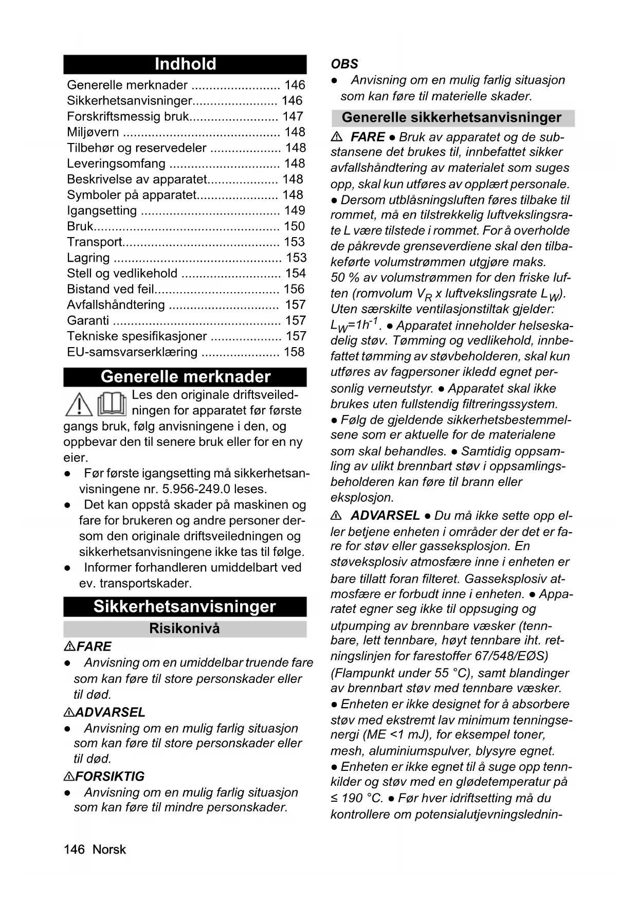 OBS · Apparatet skal kun lagres innendors. · Klemfare! Bruk hansker nár du tar av ellr setter paa sugehodet, filterenheten ellr oppsamlingsbeholderen. · Fare for skader! Du ma aldri suge uten ellr med skadet filter. · Bruk vnesko nár du betjener apparatet. · Apparatet skal kun beveges i skritthastighet og av to personer i skraninger. · Pase at det ilke kommer ut stov nár du skifter tilbehorsdeler. · Ved normaldrift kan overflatetemperaturen stige til opp til 135^. Unnga a faknekk pa sugeslangeenheten. · Utfor en regelmessig visuell inspeksjon av slangene.