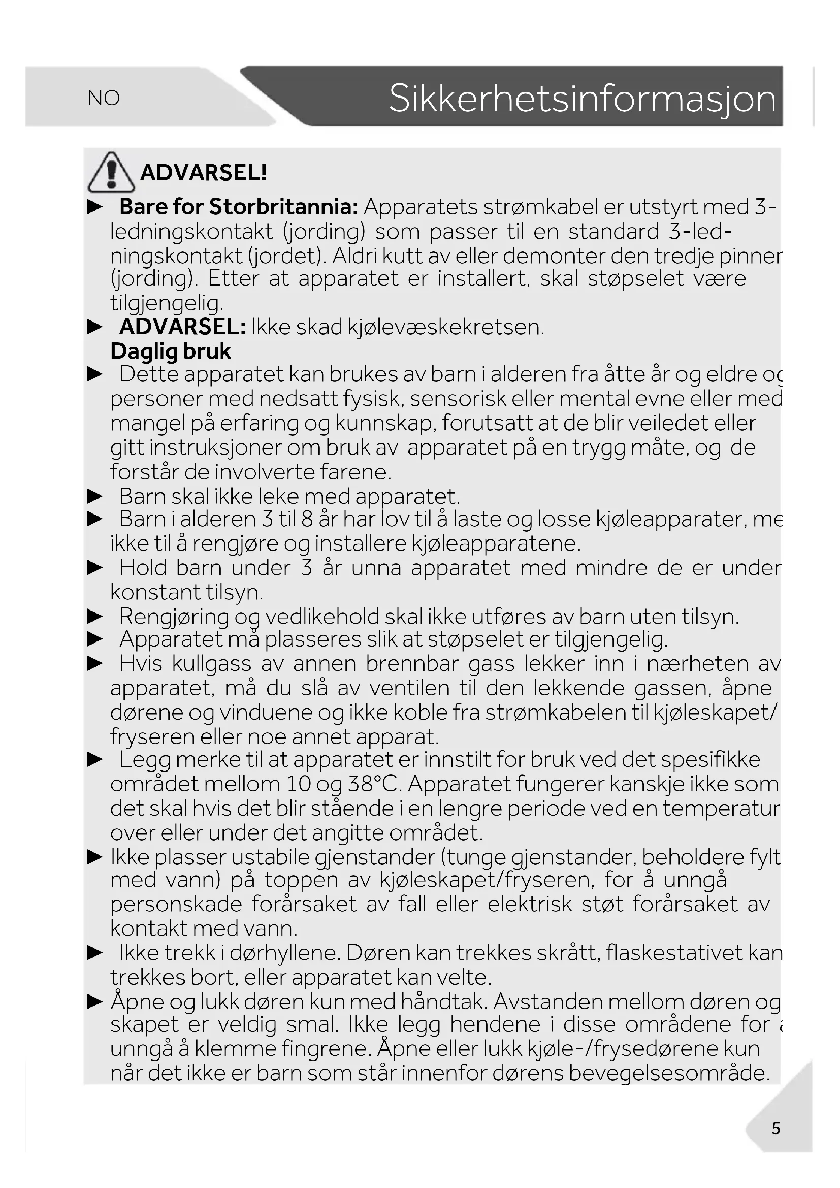 ADVARSEL! ► Bare for Storbritannia: Apparatets strømkabel er utstyrt med 3- ledningskontakt (jording) som passer til en standard 3-led- ningskontakt (jordet). Aldri kutt av eller demonter den tredje pinnen (jording). Etter at apparatet er installert, skal støpselet være tilgjengelig. ► ADVARSEL: Ikke skad kjølevæskekretsen. Daglig bruk ► Dette apparatet kan brukes av barn i alderen fra åtte år og eldre og personer med nedsatt fysisk, sensorisk eller mental evne eller med mangel på erfaring og kunnskap, forutsatt at de blir veiledet eller gitt instruksjoner om bruk av apparatet på en trygg måte, og de forstår de involverte farene. ► Barn skal ikke leke med apparatet. ► Barn i alderen 3 til 8 år har lov til å laste og losse kjøleapparater, men ikke til å rengjøre og installere kjøleapparatene. ► Hold barn under 3 år unna apparatet med mindre de er under konstant tilsyn. ► Rengjøring og vedlikehold skal ikke utføres av barn uten tilsyn. ► Apparatet må plasseres slik at støpselet er tilgjengelig. ► Hvis kullgass av annen brennbar gass lekker inn i nærheten av apparatet, må du slå av ventilen til den lekkende gassen, åpne dørene og vinduene og ikke koble fra strømkabelen til kjøleskapet/ fryseren eller noe annet apparat. ► Legg merke til at apparatet er innstilt for bruk ved det spesifikke området mellom 10 og 38°C. Apparatet fungerer kanskje ikke som det skal hvis det blir stående i en lengre periode ved en temperatur over eller under det angitte området. ► Ikke plasser ustabile gjenstander (tunge gjenstander, beholdere fylt med vann) på toppen av kjøleskapet/fryseren, for å unngå personskade forårsaket av fall eller elektrisk støt forårsaket av kontakt med vann. ► Ikke trekk i dørhyllene. Døren kan trekkes skrått, flaskestativet kan trekkes bort, eller apparatet kan velte. ► Åpne og lukk døren kun med håndtak. Avstanden mellom døren og skapet er veldig smal. Ikke legg hendene i disse områdene for å unngå å klemme fingrene. Åpne eller lukk kjøle-/frysedørene kun når det ikke er barn som står innenfor dørens bevegelsesområde.Sikkerhetsinformasjon