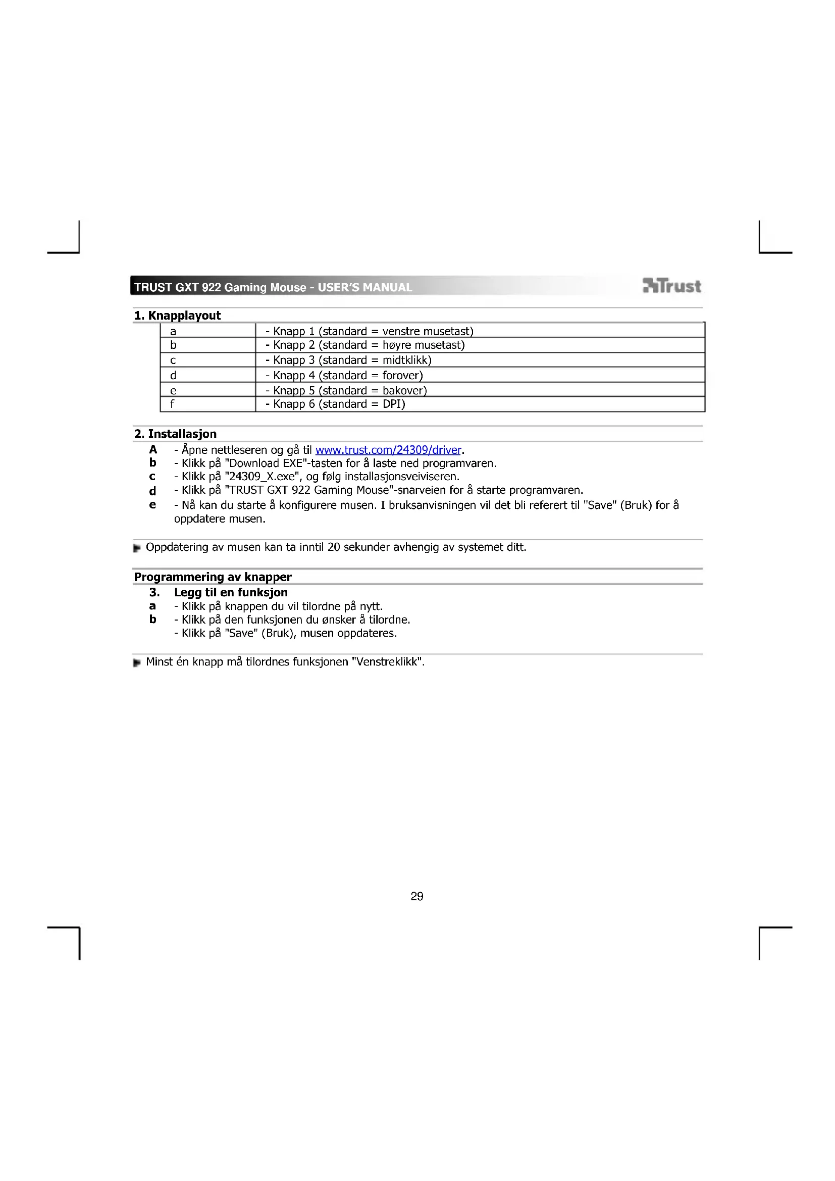 - Åpne nettleseren og gå til www.trust.com/24309/driver. - Klikk på "Download EXE"-tasten for å laste ned programvaren. - Klikk på "24309_X.exe", og følg installasjonsveiviseren. - Klikk på "TRUST GXT 922 Gaming Mouse"-snarveien for å starte programvaren. - Nå kan du starte å konfigurere musen. I bruksanvisningen vil det bli referert til "Save" (Bruk) for å oppdatere musen. Oppdatering av musen kan ta inntil 20 sekunder avhengig av systemet ditt. Programmering av knapper