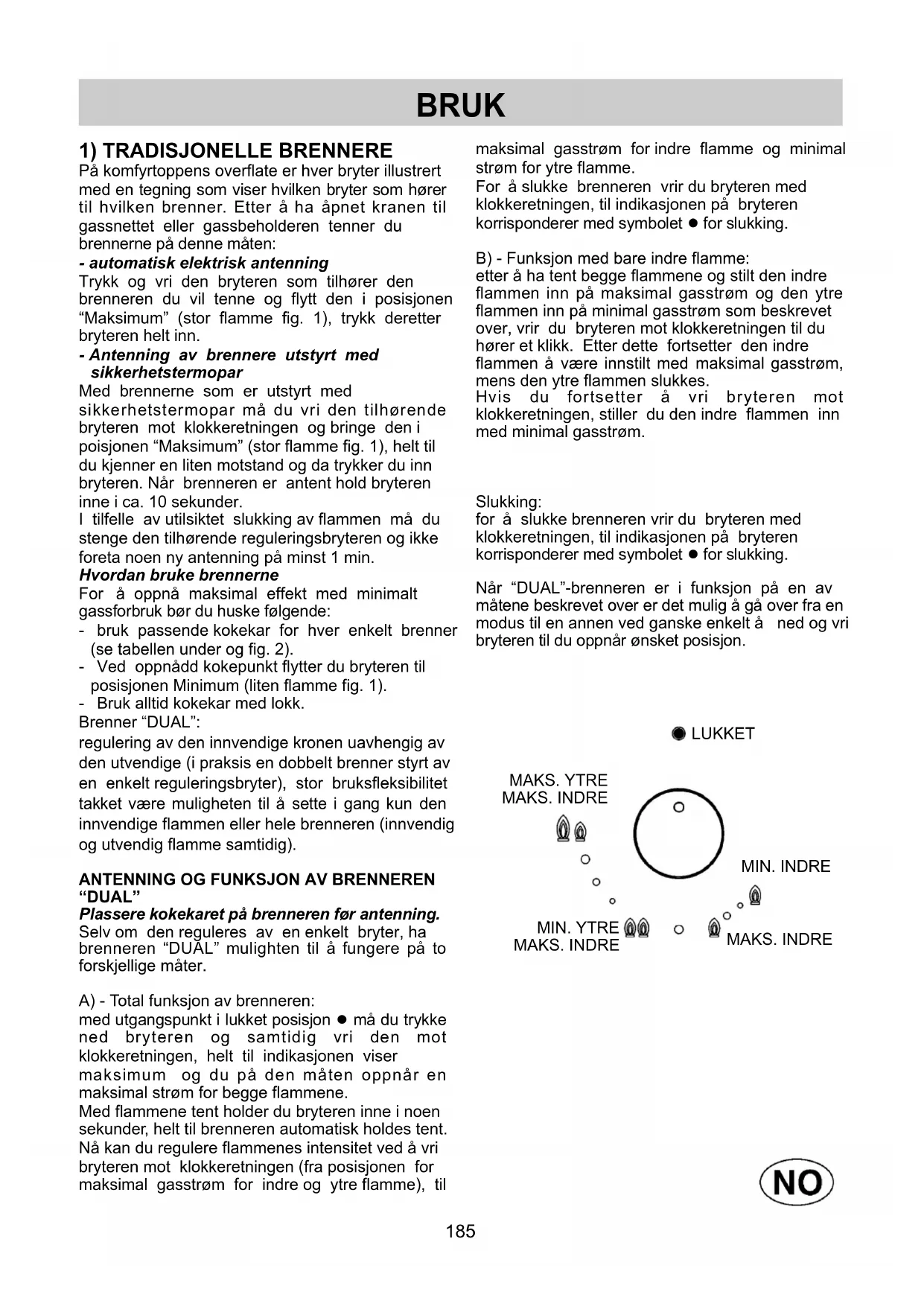På komfyrtoppens overflate er hver bryter illustrert med en tegning som viser hvilken bryter som hører til hvilken brenner. Etter å ha åpnet kranen til gassnettet eller gassbeholderen tenner du brennerne på denne måten: - automatisk elektrisk antenning Trykk og vri den bryteren som tilhører den brenneren du vil tenne og flytt den i posisjonen “Maksimum” (stor flamme fig. 1), trykk deretter bryteren helt inn. - Antenning av brennere utstyrt med sikkerhetstermopar Med brennerne som er utstyrt med sikkerhetstermopar må du vri den tilhørende bryteren mot klokkeretningen og bringe den i poisjonen “Maksimum” (stor flamme fig. 1), helt til du kjenner en liten motstand og da trykker du inn bryteren. Når brenneren er antent hold bryteren inne i ca. 10 sekunder. I tilfelle av utilsiktet slukking av flammen må du stenge den tilhørende reguleringsbryteren og ikke foreta noen ny antenning på minst 1 min. Hvordan bruke brennerne For å oppnå maksimal effekt med minimalt gassforbruk bør du huske følgende: - bruk passende kokekar for hver enkelt brenner (se tabellen under og fig. 2). - Ved oppnådd kokepunkt flytter du bryteren til posisjonen Minimum (liten flamme fig. 1). - Bruk alltid kokekar med lokk. Brenner “DUAL”: regulering av den innvendige kronen uavhengig av den utvendige (i praksis en dobbelt brenner styrt av en enkelt reguleringsbryter), stor bruksfleksibilitet takket være muligheten til å sette i gang kun den innvendige flammen eller hele brenneren (innvendig og utvendig flamme samtidig).