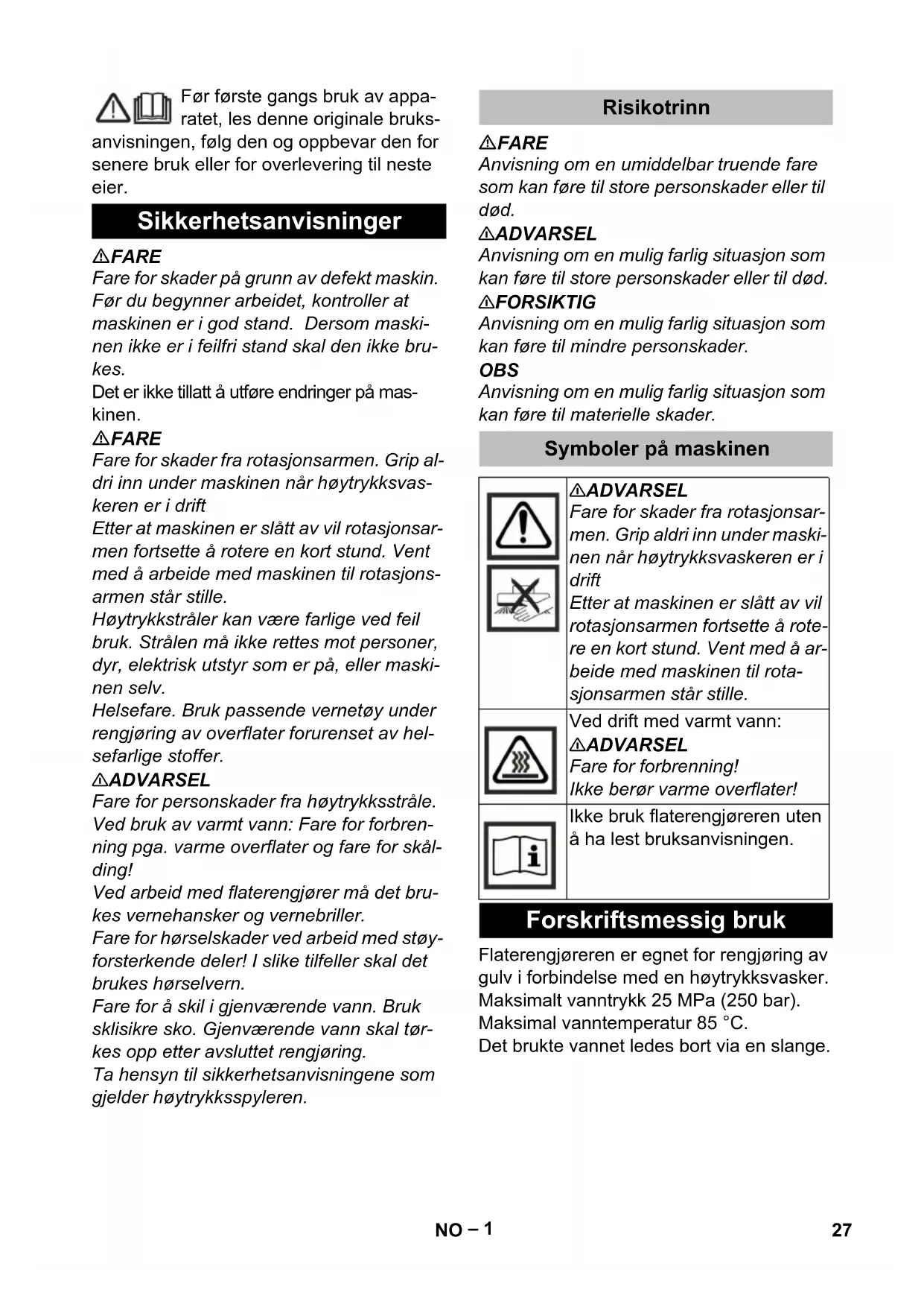 6.371-011.0 Forlængerslange 4.441-040.0 Hjælp ved fejl 26 DA– 1 Før første gangs bruk av appa- ratet, les denne originale bruks- anvisningen, følg den og oppbevar den for senere bruk eller for overlevering til neste eier. FARE Fare for skader på grunn av defekt maskin. Før du begynner arbeidet, kontroller at maskinen er i god stand. Dersom maski- nen ikke er i feilfri stand skal den ikke bru- kes. Det er ikke tillatt å utføre endringer på mas- kinen. FARE Fare for skader fra rotasjonsarmen. Grip al- dri inn under maskinen når høytrykksvas- keren er i drift Etter at maskinen er slått av vil rotasjonsar- men fortsette å rotere en kort stund. Vent med å arbeide med maskinen til rotasjons- armen står stille. Høytrykkstråler kan være farlige ved feil bruk. Strålen må ikke rettes mot personer, dyr, elektrisk utstyr som er på, eller maski- nen selv. Helsefare. Bruk passende vernetøy under rengjøring av overflater forurenset av hel- sefarlige stoffer. 몇 ADVARSEL Fare for personskader fra høytrykksstråle. Ved bruk av varmt vann: Fare for forbren- ning pga. varme overflater og fare for skål- ding! Ved arbeid med flaterengjører må det bru- kes vernehansker og vernebriller. Fare for hørselskader ved arbeid med støy- forsterkende deler! I slike tilfeller skal det brukes hørselvern. Fare for å skil i gjenværende vann. Bruk sklisikre sko. Gjenværende vann skal tør- kes opp etter avsluttet rengjøring. Ta hensyn til sikkerhetsanvisningene som gjelder høytrykksspyleren. FARE Anvisning om en umiddelbar truende fare som kan føre til store personskader eller til død. 몇 ADVARSEL Anvisning om en mulig farlig situasjon som kan føre til store personskader eller til død. 몇 FORSIKTIG Anvisning om en mulig farlig situasjon som kan føre til mindre personskader. OBS Anvisning om en mulig farlig situasjon som kan føre til materielle skader. Flaterengjøreren er egnet for rengjøring av gulv i forbindelse med en høytrykksvasker. Maksimalt vanntrykk 25 MPa (250 bar). Maksimal vanntemperatur 85 °C. Det brukte vannet ledes bort via en slange. Sikkerhetsanvisninger Risikotrinn Symboler på maskinen 몇 ADVARSEL Fare for skader fra rotasjonsar- men. Grip aldri inn under maski- nen når høytrykksvaskeren er i drift Etter at maskinen er slått av vil rotasjonsarmen fortsette å rote- re en kort stund. Vent med å ar- beide med maskinen til rota- sjonsarmen står stille. Ved drift med varmt vann: 몇 ADVARSEL Fare for forbrenning! Ikke berør varme overflater! Ikke bruk flaterengjøreren uten å ha lest bruksanvisningen. Forskriftsmessig bruk 27NO– 2 Materialet i emballasjen kan resirku- leres. Ikke kast emballasjen i hus- holdningsavfallet, men lever den inn til re- sirkulering. Gamle maskiner inneholder verdifulle materialer som kan resirkuleres. Dis- se bør leveres inn til gjenvinning. Gamle maskiner skal derfor avhendes i eg- nede innsamlingssystemer. Anvisninger om innhold (REACH) Aktuell informasjon om stoffene i innholdet finner du under: www.kaercher.com/REACH For å sikre en feilfri bruk av høytrykksvas- keren må du bruke en passende høytrykks- dyse. Merknad: De nødvendige dysepakkene er tilpasset hver enkelt høytrykkspyler som skal tilko- ples og må bestilles separat. Figur 1, se omslagssiden 1 Dysestørrelse (eksempel). Les av dysestrørrelse på høytrykksvas- kerens typeskilt. Velg passende dysepakke for høy- trykksvaskeren fra følgende tabell. Figur 2, se omslagssiden 1 O-ring 2 Rotasjonsarm 3 Dyse 4 Unionmutter O-ring legges inn i sporet på rotasjons- armen. Sett på dysen. Skru dysen lett fast med unionmutteren. Merknad: Utgangsstrålen må rettes parallelt med ro- tasjonsarmen. Figur 3, se omslagssiden Rett inn dysens nøkkelflate (nøkkelvidde10) parallelt med rota- sjonsarmen. Stram unionmutteren (nøkkelvidde 22) med skrunøkkel. Gjenta prosessen på den andre rota- sjonsarmen. Merknad: Dysene for flaterengjøreren skal ikke settes på strålerøret på høytrykksvaskeren. Figur 4, se omslagssiden 1 Injektordyse 2 Stikknøkkel Injektordyse skrus inn i injektoren ved hjelp av stikknøkkel og trekkes til for hånd (8 Nm). Stikknøkkel er vedlagt i dysesettet. Figur 5, se omslagssiden 1 Håndsprøytepistol med knott 2 Håndsprøytepistol uten knott 3 Nippel, kort 4 Nippel, lang Apparatet leveres montert med kort nippel til bruk på en håndsprøytepistol med knott. Ved bruk med en håndsprøytepistol uten knott, må den korte nippelen skrues ut og erstattes med den vedlagte lange nippelen. Smør O-ringene på nippelen før montering. Miljøvern Dysepakker Dysestørrel- se høy- trykksvas- ker Dysepakke Dysestørrel- se dysepak-