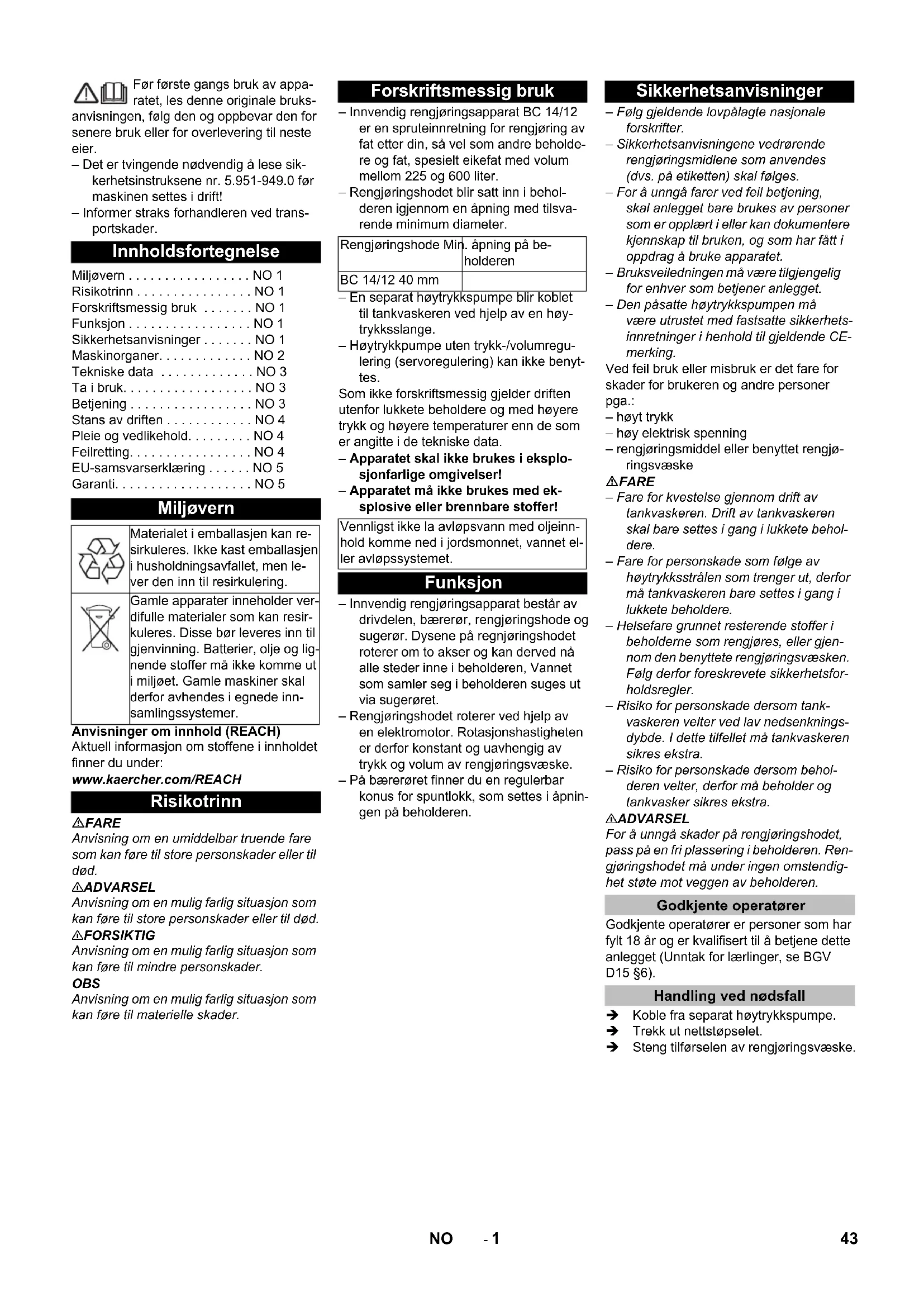 (20-25) Farge på sugedyse gul grønn blå Farge på sprutedyse asur rød lilla Sugedyse Sprutedyser Betjening Merknad Det bør forsøkes å plassere rengjørings- maskinen mest mulig sentralt i rommet. 45NO- 4 Rengjøringsapparatet settes på objektet som skal rengjøres ved hjelp av spuntlok- konusen som sitter på bærerøret. Løsne skrukoblingen på spuntlokkonusen. Still inn innføringsdybde. Rengjørings- apparatet føres så langt inn i beholde- ren st sugerøret berører bunnen. Ren- gjøringsapparatet løftes litt (2-3 mm) slik at sugerøret ikke berører bunnen mer. Trekk til skrukoblingen på spuntlokkon- usen. Monter holder på bærerøret for å sikre en stabil posisjon av rengjøringsappratet. Koble høytrykkspumpen til tankvaske- ren ved hjelp av en høytrykksslange. Koble vannutløp-stussen til en passen- de avløpsslange. Koble rengjøringsapparatet til strøma- dapteren, bruk eventuelt skjøteledning. Sett i støpselet. Sett omkoblingshendelen til SPRAY- posisjon. Det utføres rengjøring samti- dig som overflødig vann som samler seg inne i beholderen suges ut. Koble inn rengjøringsapparatet med apparatbryteren. Kontrollampe lyser grønt. Åpne tilførselen av rengjøringsvæske. Koble til separat høytrykkspumpe. Ved slutten av rengjøringen settes om- koblingshendelen til SUCTION-posi- sjon for å få suget ut resten av vannet i beholderen. Koble fra separat høytrykkspumpe. Steng tilførselen av rengjøringsvæske. Slå av rengjøringsapparatet med appa- ratbryteren. Kontrollampen slukker. Trekk ut nettstøpselet. Ta tankvaskeren ut av beholderen. Grunnlaget for et driftssikkert anlegg er et regelmessig vedlikehold. Bruk kun originale reservedeler fra produ- senten eller deler som produsenten anbe- faler, som – reserve- og slitedeler – tilbehørdeler – Driftsmidler – Rengjøringsmiddel FARE Fare for ulykker ved arbeid på anlegget! Ved alt arbeide: Steng av spenningstilførselen til høy- trykkspumpen på hovedbryteren og sik- re den. Steng tilførselen av rengjøringsvæske. Trekk ut nettstøpselet. Vedlikeholdsarbeider må kun utføres av opplærte personer som kjenner vaskean- legget godt og som kan vedlikeholde det. For å sikre stabil drift av anlegget, anbefa- ler vi at du inngår en vedlikeholdsavtale. Vennligst ta kontakt med den ansvarlige Kärcher kundetjenesten. Fjerne forurensninger på området med tanning på rengjøringshodet. Kontroller at skruen sitter godt. FARE Fare for ulykker ved arbeid på anlegget! Ved alt arbeide: Steng av spenningstilførselen til høy- trykkspumpen på hovedbryteren og sik- re den. Steng tilførselen av rengjøringsvæske. Trekk ut nettstøpselet. Eier Arbeid med merknaden "Eier" må kun utføres av personer som er opplært i bruken, og som kan utføre betjening og vedlikehold av høytrykksanleggene på en sikker måte. Autoriserte elektrikere Bare personer med en elektroteknisk yrkesutdannelse. Kundetjeneste Arbeid med merknaden "Kundetjenes- te", må kun utføres av montører fra Kär- chers kundetjeneste. 1 Akselstubb 2 Glidering-pakning 3 Kjeglehjul 4 Sprutedyse 5 Underlagsskive Skru ut akseltapp , ta av kjeglehjul med pakninger og underlagsskive. Gjengene på den nye akseltappen smøres med tetningsmiddel. Sett på kjeglehjul med pakninger og un- derlagsskive, skru inn akseltapp. Still inn innføringsdybde og monter holderen. Koble til slanger. Merknad Avløpsslangen må ha en innvendig diame- ter på minst 17 cm. For å forhindre så godt som mulig eventuelle trykkfall i slangen, må du unngå innsnevringer i slangen eller kraftige bøyninger på slangen. Rengjøring Merknad For å sikre en grundig rengjøring av behol- deren, anbefaler vi å gjennomføre to ren- gjøringssykler. Varighet av en syklus er på 36 sekunder. Stans av driften Merknad Gjennomskyll tankvaskeren i 30 sekunder uten tilsetning av rengjøringsmidler før den slås av. Dermed forhindres skorpe- dannelse og tilklistring, slik at en for tidlig slitasje av tetningene unngås. Pleie og vedlikehold Hvem har tillatelse til å utføre vedlikeholdsarbeid? Vedlikeholdskontrakt Vedlikeholdsplan Daglig før maskinen tas i bruk Månedlig Feilretting Instruksjoner ved feil Merknad Rengjøringsapparatet er kun ment for drift med klokka (sett fra drivmotoren). Dersom strømadapteren skiftes eller det foretas inngrep på de elektriske koblingene, må du etterpå kontrollere at rengjøringsappa- ratet fortsatt går i riktig retning. Hvem har tillatelse til å rette på feil? Skifte rengjøringshode 46 NO- 5 Vi erklærer hermed at maskinen angitt ned- enfor oppfyller de grunnleggende sikker- hets- og helsekravene i de relevante EU-di- rektivene, med hensyn til både design, kon- struksjon og type markedsført av oss. Ved endringer på maskinen som er utført uten vårt samtykke, mister denne erklæringen sin gyldighet. Undertegnede handler på vegne av og med fullmakt fra styret. Ansvarlig for dokumentasjon: S. Reiser Alfred Kärcher SE & Co. KG Alfred-Kärcher-Straße 28-40 71364 Winnenden (Germany) Tel.: +49 7195 14-0 Fax: +49 7195 14-2212 Winnenden, 2018/10/01 Vår ansvarlige salgsorganisasjon for det enkelte land har utgitt garantibetingelsene som gjelder i det aktuelle landet. Eventuelle feil på maskinen blir reparert gratis i ga- rantitiden dersom disse kan føres tilbake til material- eller produksjonsfeil. Ved behov for garantireparasjoner, vennligst henvend deg med kjøpskvitteringen til din forhandler eller nærmeste autoriserte kundeservice. Feilsøking Feil Mulige årsaker Retting av hvem Motor dreier seg ikke Ingen spenning på maskinen. Kontroller sikring, strømadapter og ledninger. Autoriserte elektrike-