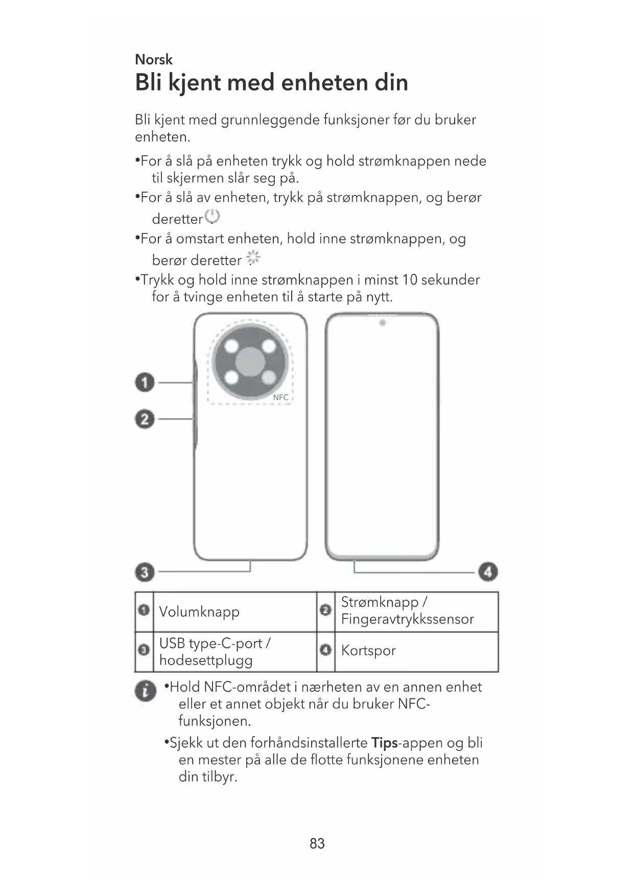 82Norsk Bli kjent med enheten din Bli kjent med grunnleggende funksjoner før du bruker enheten.